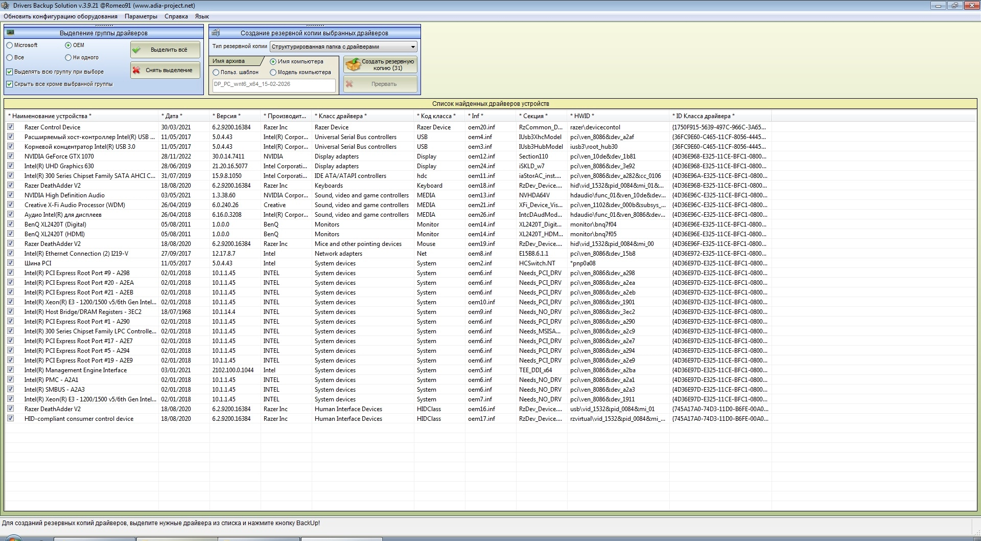 • Резервное копирование установленных в системе драйверов