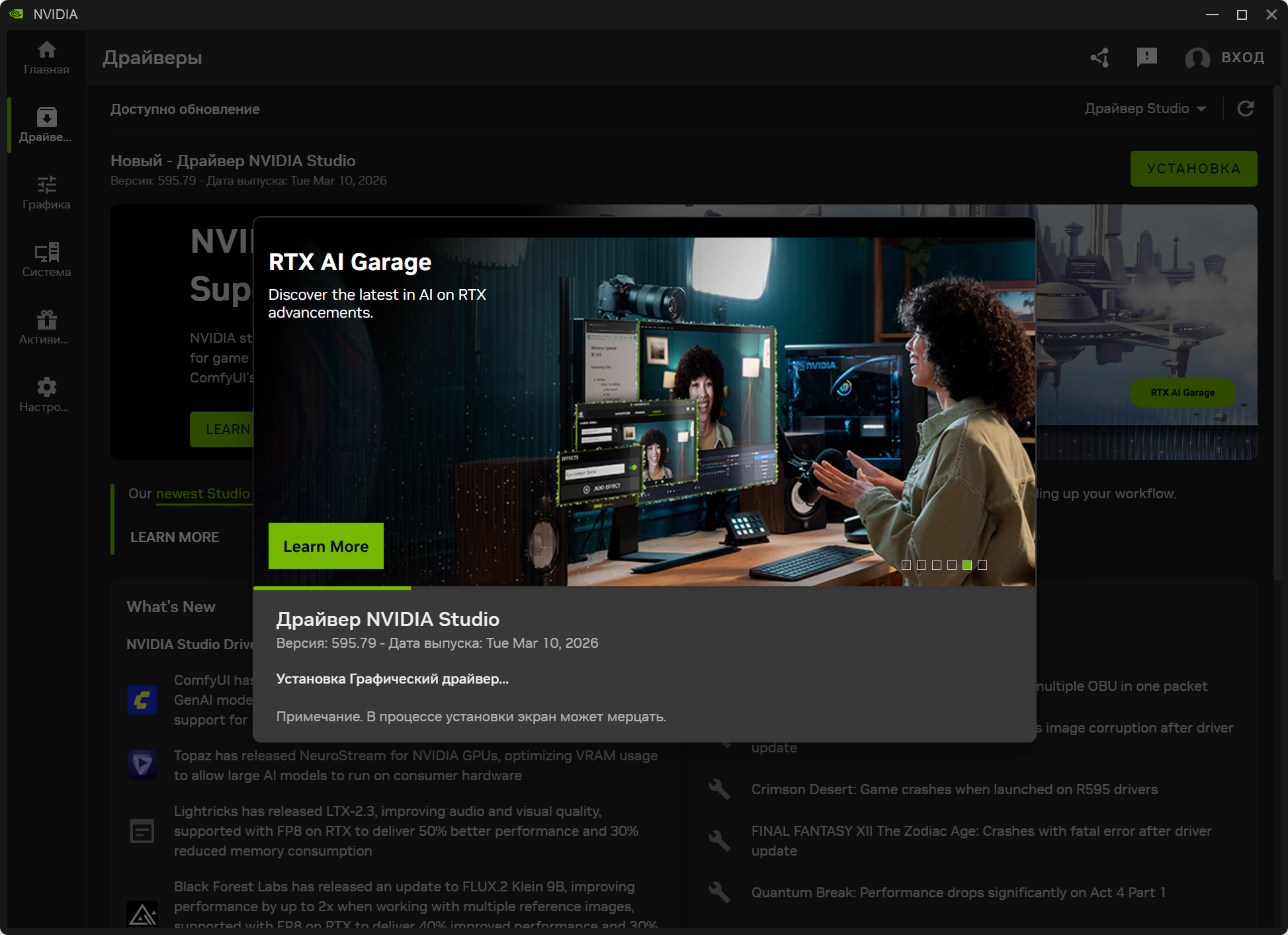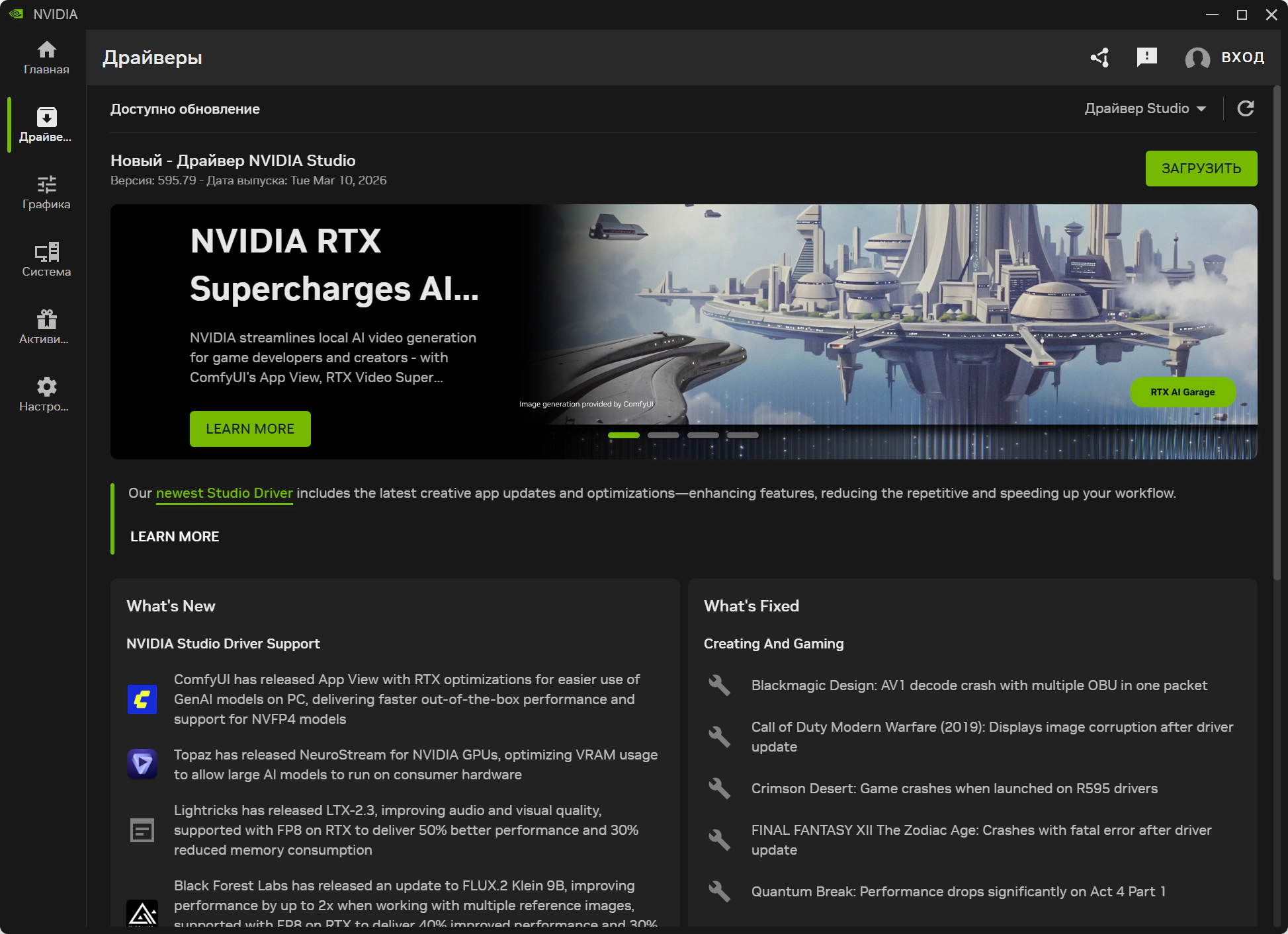 • Мартовский драйвер NVIDIA Studio обеспечивает оптимальную поддержку новейших творческих приложений и обновлений, включая Topaz NeuroStream, Lightricks LTX-2.3, поддержку Windows ML для VoiceMod, а также последние обновления для FLUX.2 Klein 9B и ComfyUI.