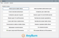 Any Burn - небольшая бесплатная утилита для работы с CD/DVD/Blue-ray дисками. Интерфейс программы достаточно удобен: главное окно представляет собой набор закладок, которые выбираются в зависимости от конкретной задачи. Можно записать на диск готовые образы или отдельные файлы и папки, записать Audio-CD из имеющихся файлов аудиоформата, стереть перезаписываемый диск, создать образ диска или отдельных папок/файлов, скопировать диск и др. операции. Этот инструмент станет неплохой альтернативой существующим платным и "тяжелым" программам по управлению CD/DVD/Blue-ray дисков.