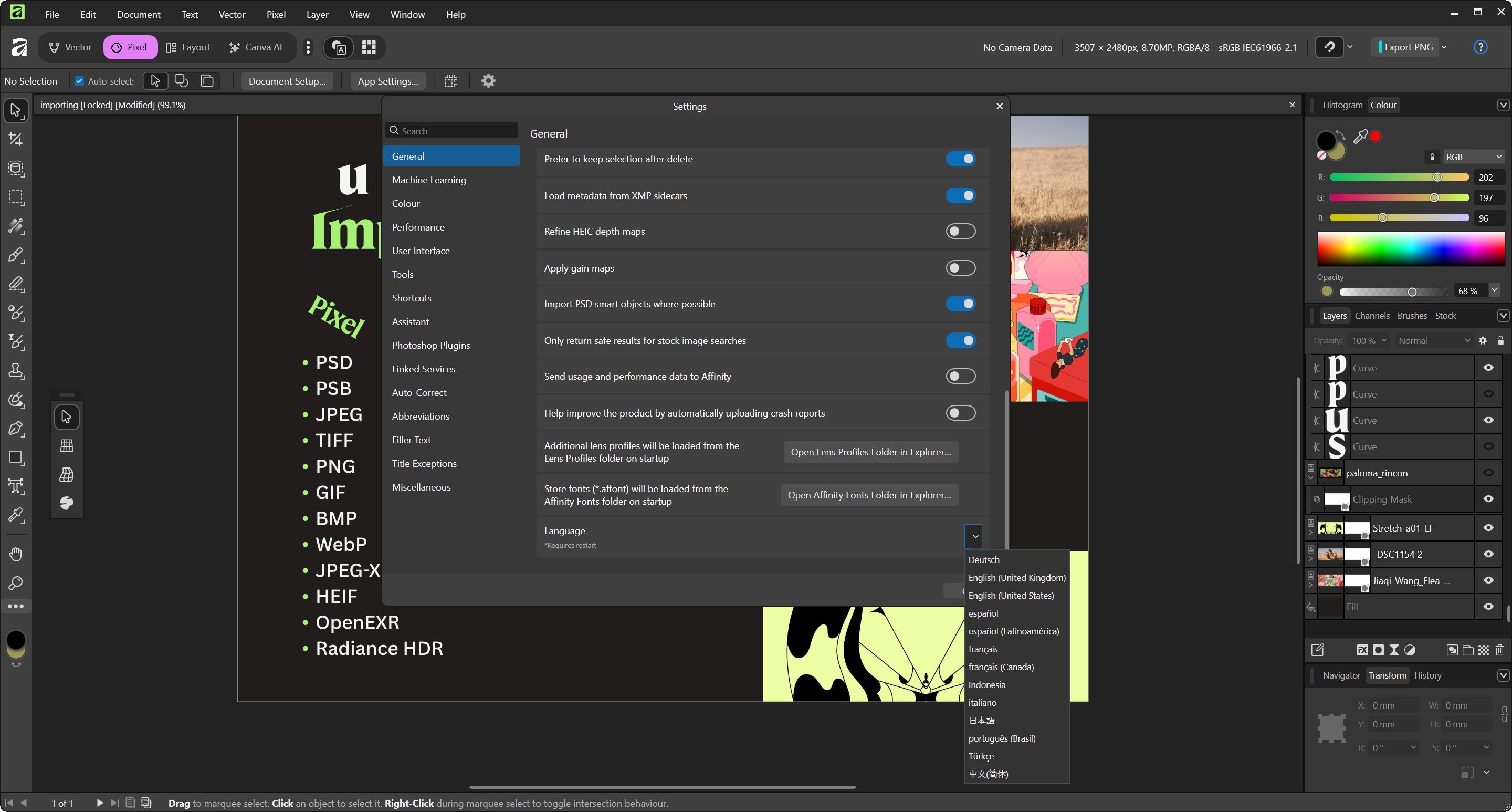• Для импорта полноценно поддерживаются растровые и векторные форматы Adobe, RAW различных камер, для экспорта — также обширный набор форматов с гибкой настройкой.