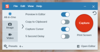 Snagit предлагает неограниченные возможности для захвата изображений - экран целиком, одно или сразу несколько окон и графических объектов (значки, экранные кнопки, панели, меню и т.д.), области произвольной или сложной формы (многоугольник, эллипс, прямоугольник со скругленными углами), полноэкранные окна DOS-программ и окна приложений DirectX (игры, видеопроигрыватели), Программа может получать изображения со сканеров или цифровых камер с интерфейсом TWAIN, захватывать фоновый рисунок рабочего стола Windows и содержимое буфера обмена, а также импортировать значки из EXE-файлов и библиотек DLL.