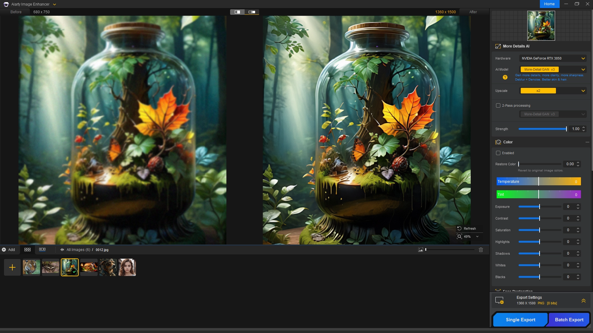 Программа позволяет легко улучшать фотографии и AI-арт, делая процесс максимально автоматизированным: загрузите изображение, выберите модель ИИ и масштабирование, а затем экспортируйте улучшенные изображения