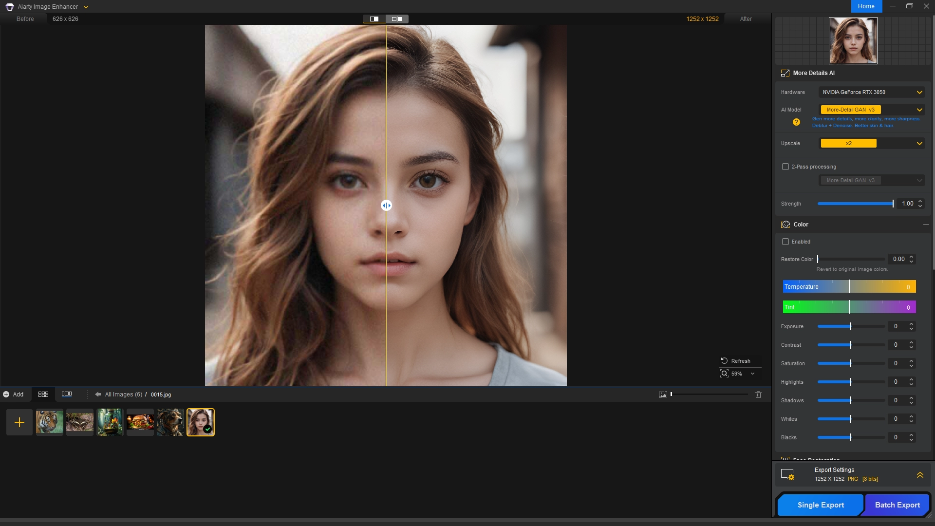 • Aiarty Image Enhancer особенно полезен для работы с изображениями низкого качества, включая AI-генерируемые изображения, фотографии и иллюстрации. Он позволяет улучшать детали кожи, волос, тканей и других текстур, делая их более реалистичными и четкими. Программа поддерживает пакетную обработку изображений, что экономит время при работе с большим количеством данных.