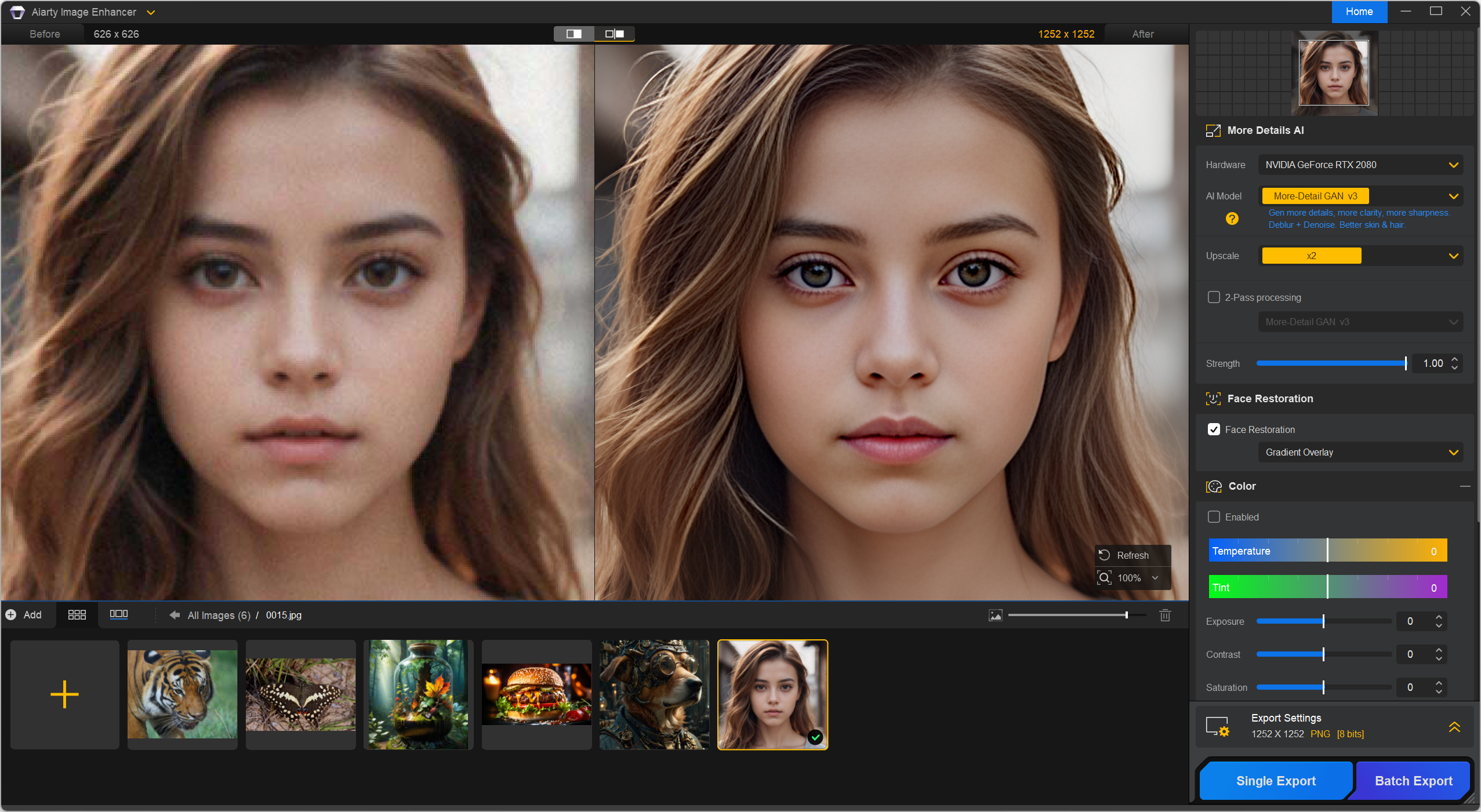 • Aiarty Image Enhancer особенно полезен для работы с изображениями низкого качества, включая AI-генерируемые изображения, фотографии и иллюстрации. Он позволяет улучшать детали кожи, волос, тканей и других текстур, делая их более реалистичными и четкими. Программа поддерживает пакетную обработку изображений, что экономит время при работе с большим количеством данных.