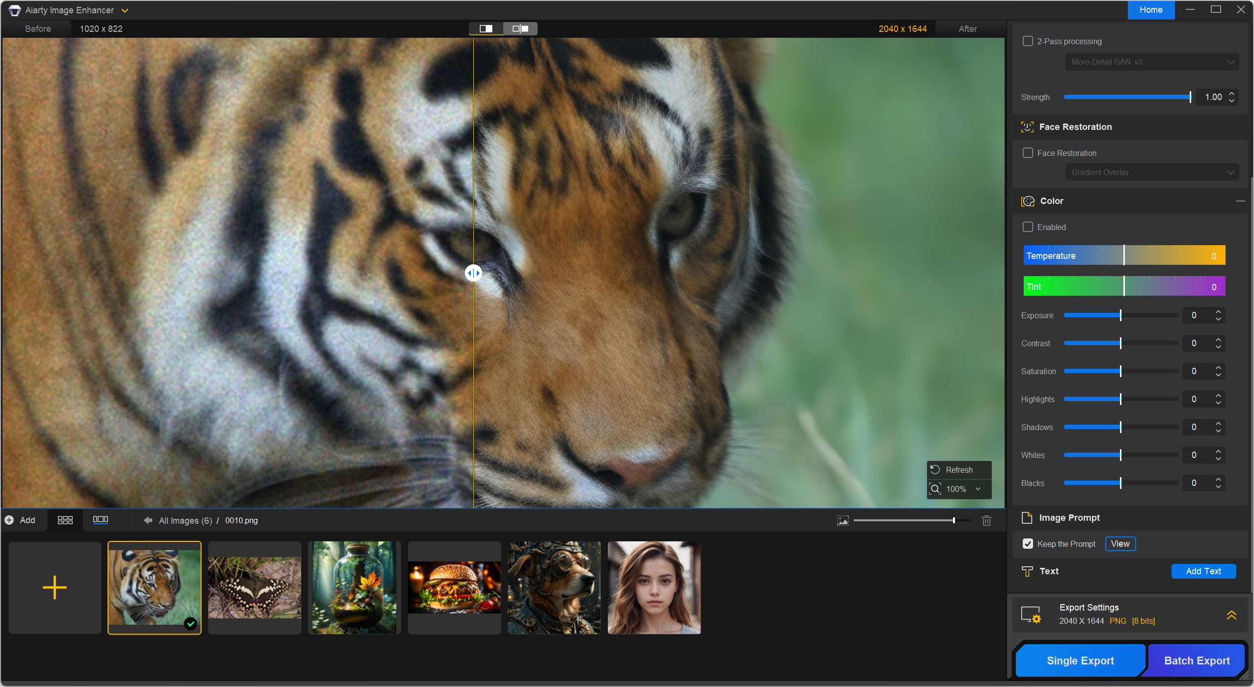 • Интегрированная цветокоррекция для ярких результатов: благодаря встроенной функции цветокоррекции, улучшение качества станет простым и доступным. Пользователи смогут точно настроить такие важные параметры, как цветовая температура, оттенок, экспозиция, контрастность и насыщенность, для улучшения тональности и усиления визуального эффекта. Этот инструмент позволяет добиваться потрясающих, ярких результатов прямо в рабочем процессе Aiarty, без необходимости использования дополнительного программного обеспечения для редактирования.