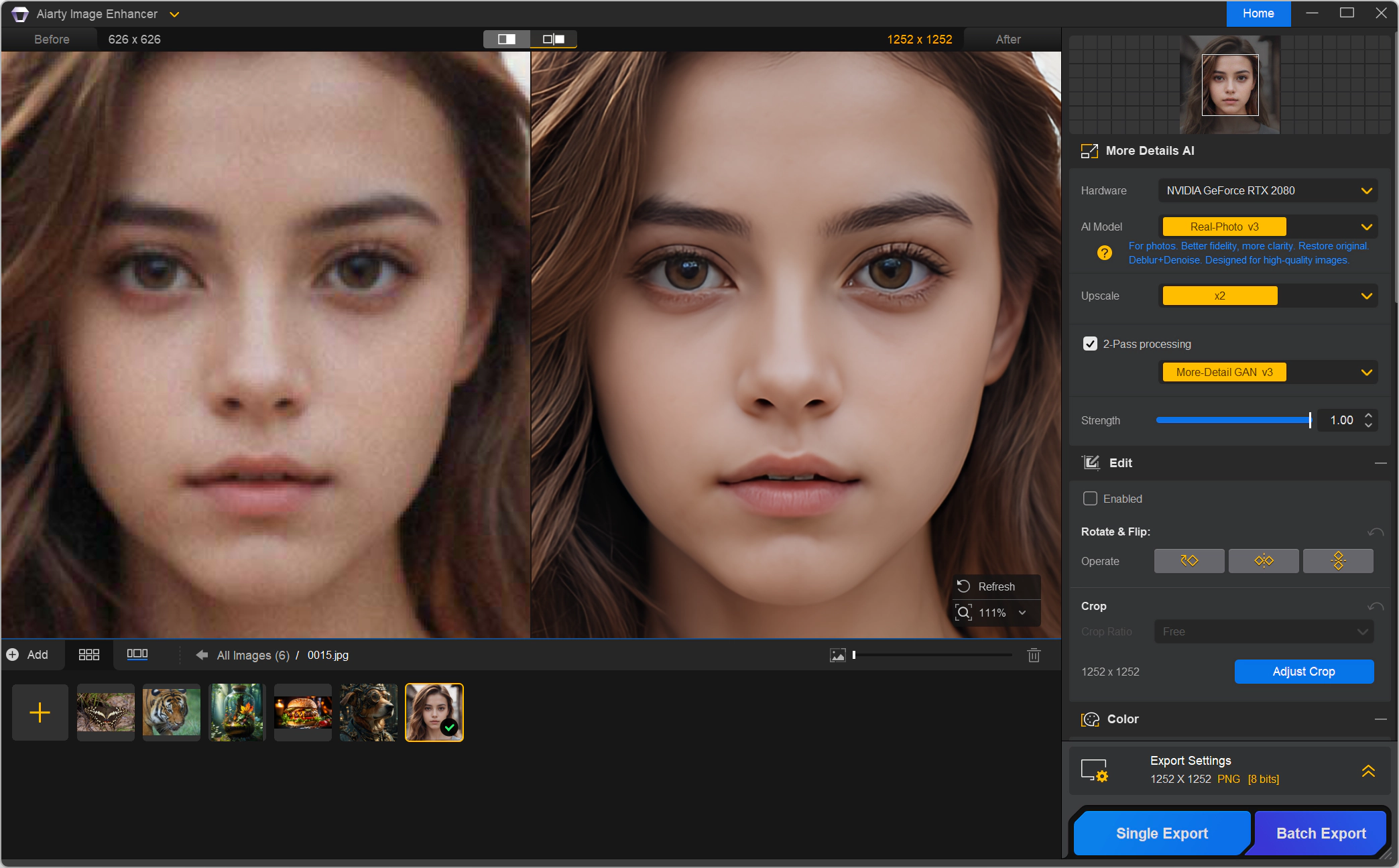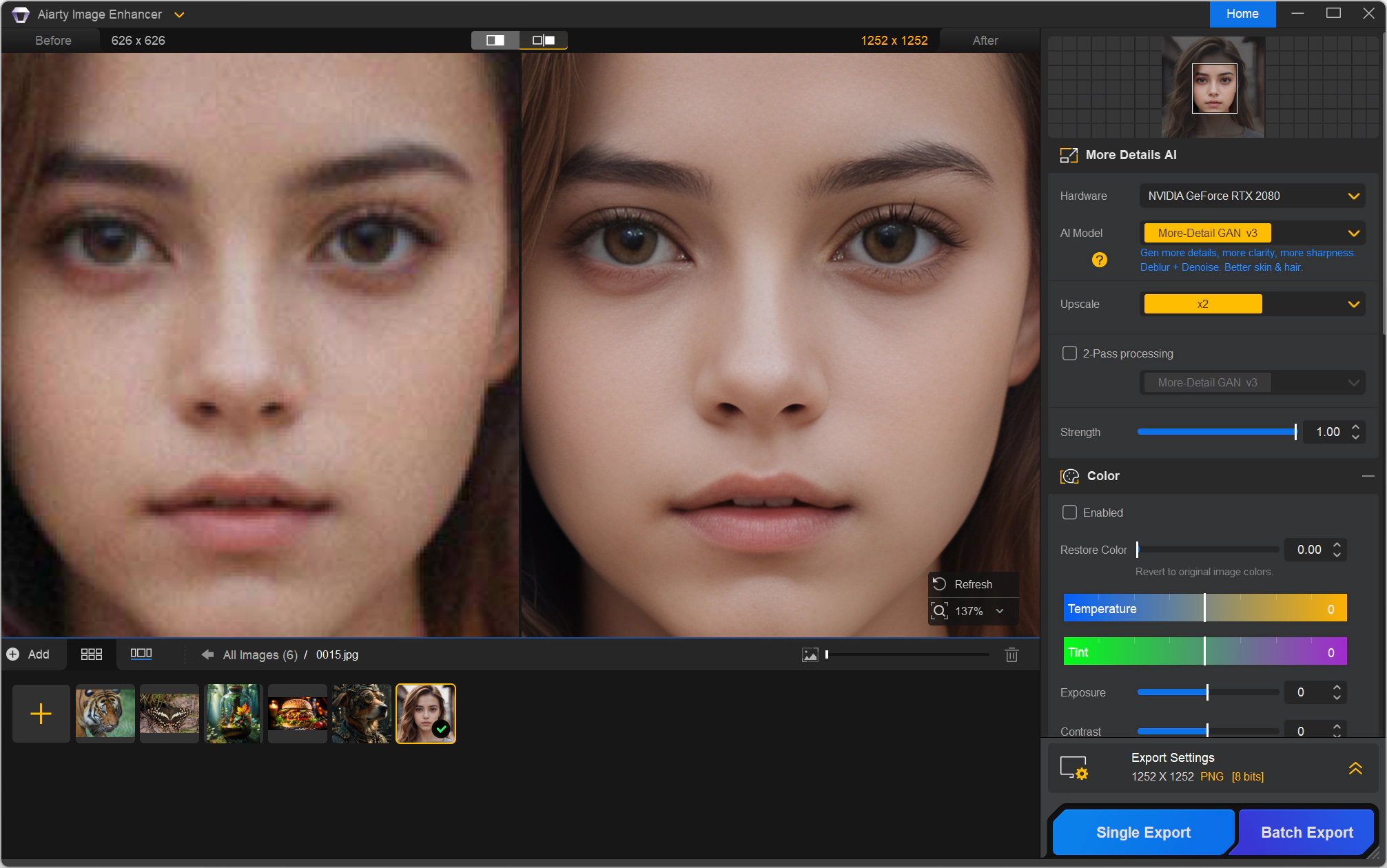 • Aiarty Image Enhancer особенно полезен для работы с изображениями низкого качества, включая AI-генерируемые изображения, фотографии и иллюстрации. Он позволяет улучшать детали кожи, волос, тканей и других текстур, делая их более реалистичными и четкими. Программа поддерживает пакетную обработку изображений, что экономит время при работе с большим количеством данных.