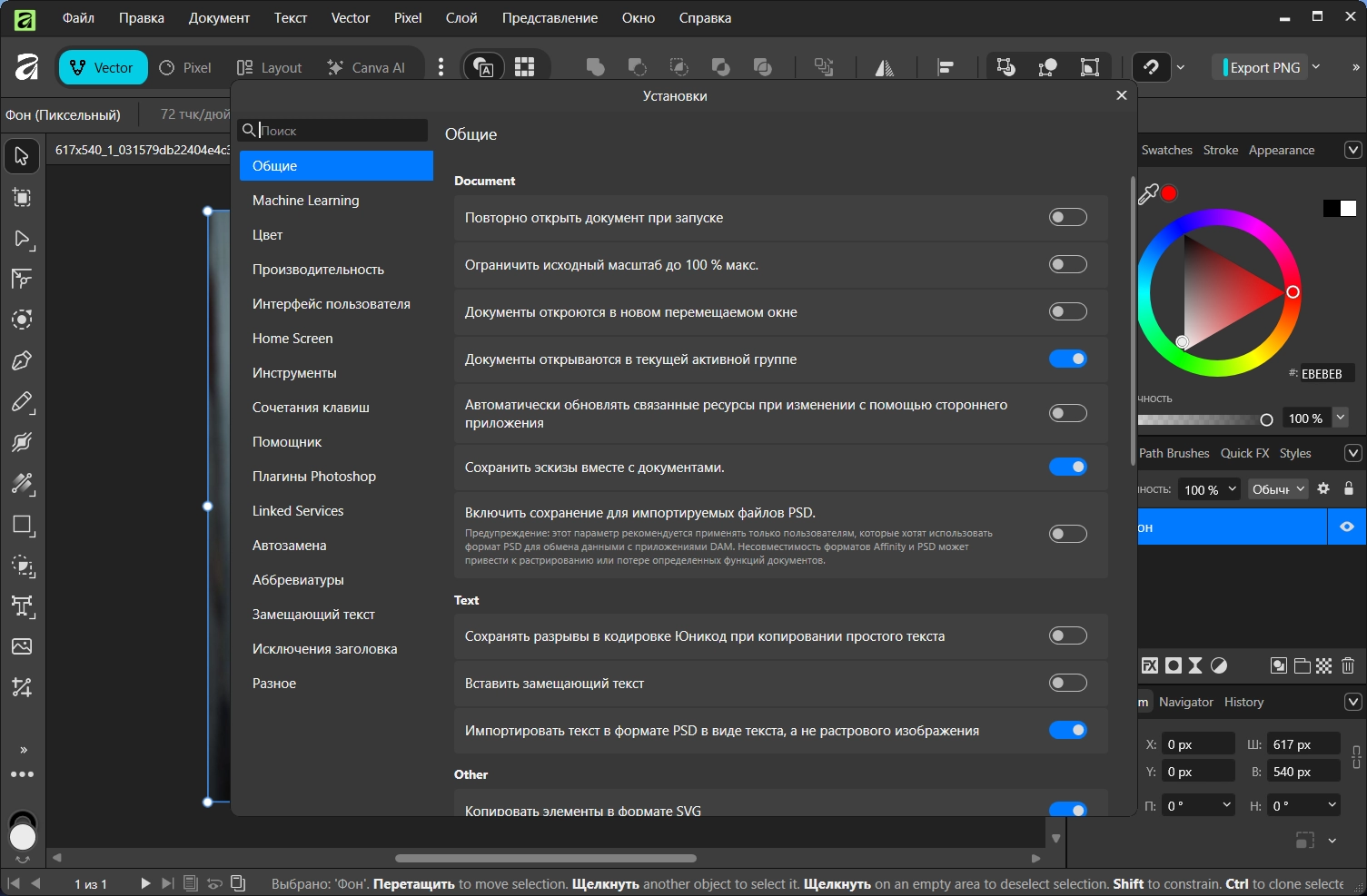 • Настройки рабочей среды позволяют адаптировать программу под индивидуальный стиль работы. Можно переставлять панели, скрывать или показывать нужные блоки, сохранять несколько вариантов интерфейса для разных задач. Например, один профиль — для иллюстраций, другой — для вёрстки презентаций, третий — для подготовки материалов в социальные сети. Такой подход делает Affinity Canva универсальным инструментом и для фрилансеров, и для сотрудников студий, которым нужно быстро переключаться между типами проектов, сохраняя при этом высокое качество результата.