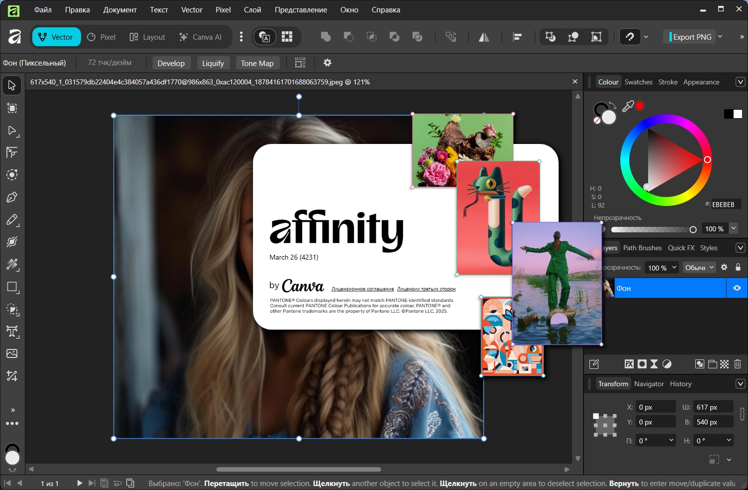 • Отдельно стоит отметить производительность Affinity Canva. Программа использует возможности многоядерных процессоров и видеокарт, благодаря чему плавно работает даже с большими документами высокого разрешения. Масштабирование, перемещение объектов, применение фильтров и эффектов происходят практически мгновенно, без задержек, к которым часто приходиться привыкаать в онлайн‑редакторах. Это особенно ценно для тех, кто ежедневно проводит много часов за графическими задачами и не хочет терять время из‑за тормозов системы.