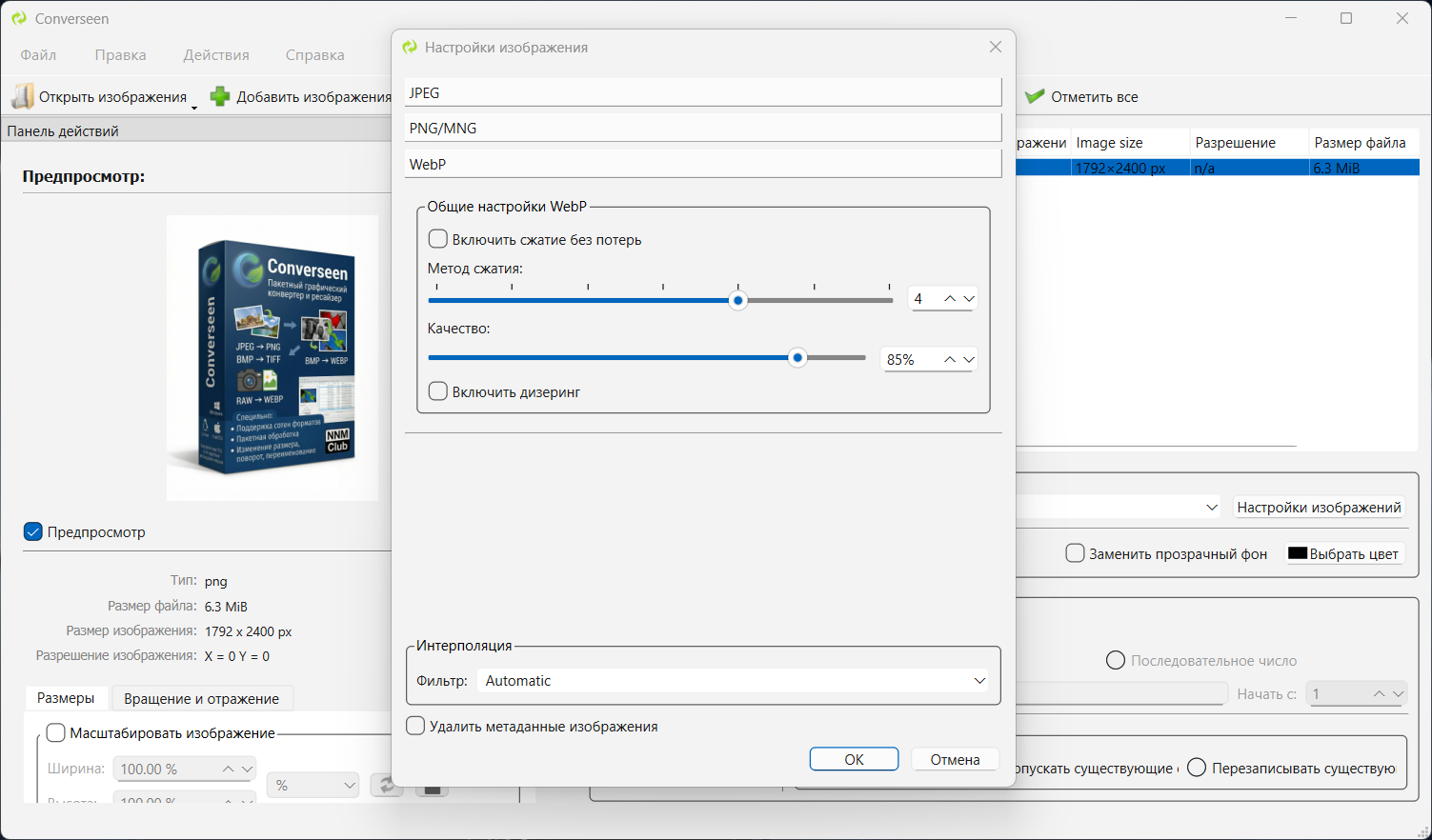 Converseen — это бесплатный кроссплатформенный пакетный обработчик изображений. Он позволяет конвертировать, изменять размер, поворачивать и отражать бесконечное количество изображений одним щелчком мыши. Более того, Converseen может преобразовать весь PDF- документ в набор изображений с заданными вами характеристиками. Вы можете выбрать из более чем 100 форматов, установить размер, разрешение и имя файла.