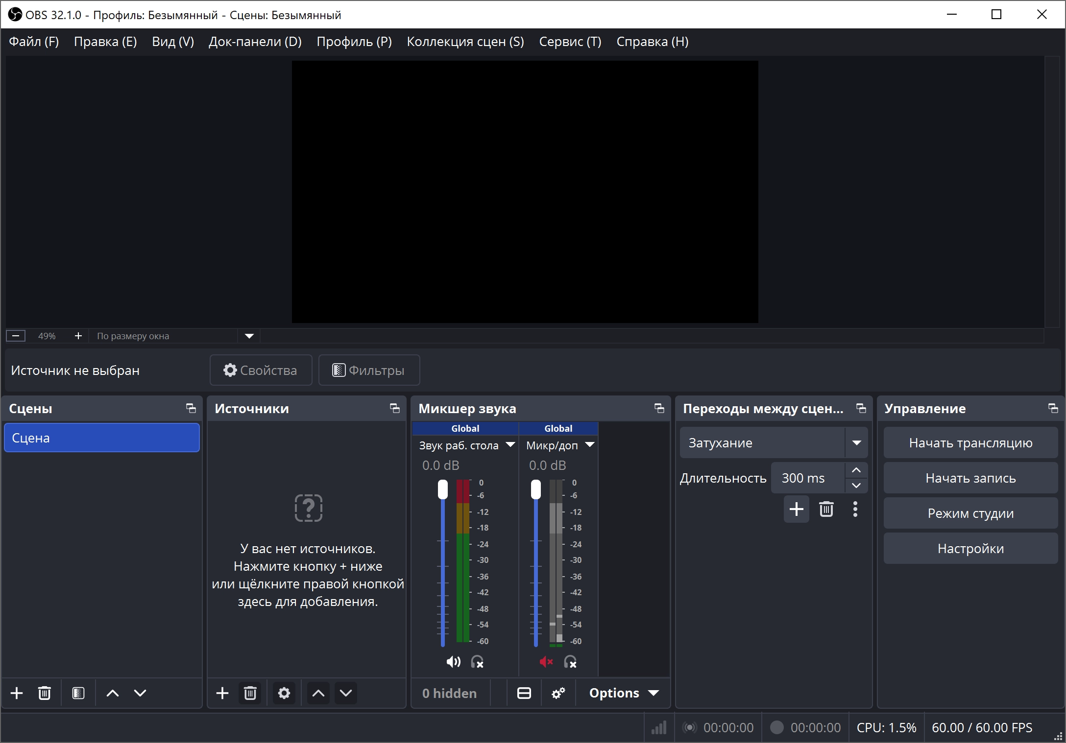 • Возможность добавлять неограниченное количество сцен и источников.