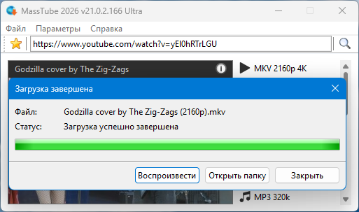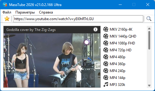 MassTube — очень простая в использовании программа для скачивания видео с YouTube (и не только) с помощью одного клика. Достаточно в строку поиска вставить адрес понравившегося ролика и нажать поиск, после чего программа предоставит список форматов и разрешений, в которых можно быстро скачать данный клип.
