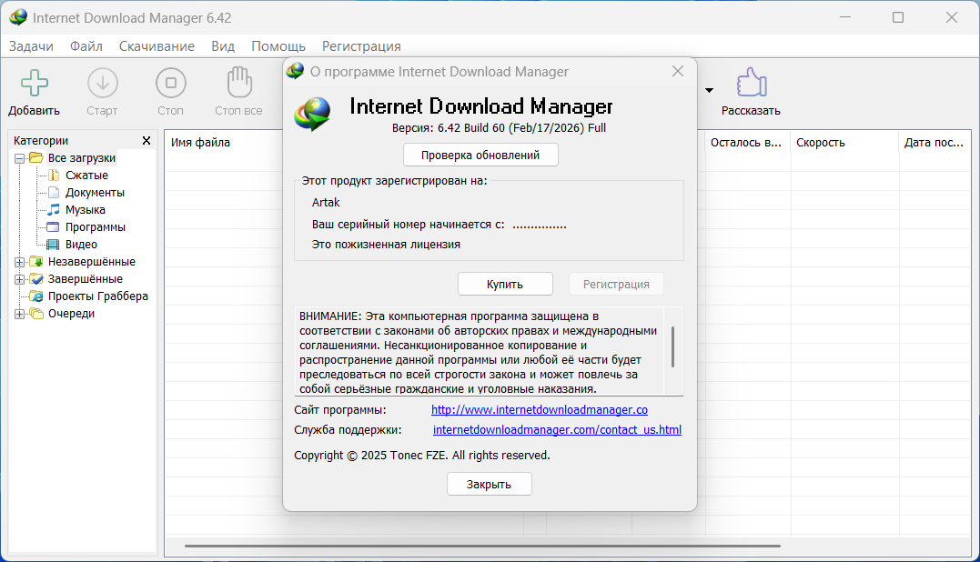 Многопоточная загрузка файлов Internet Download Manager 6.42 Build 60