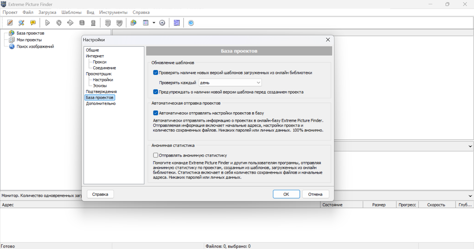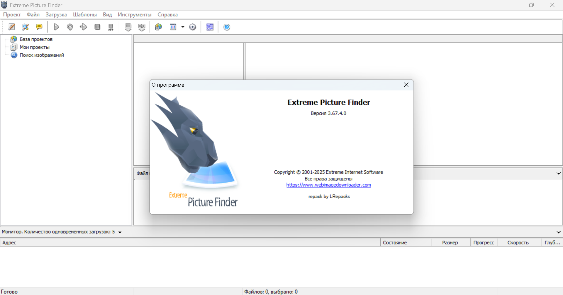 Extreme Picture Finder - средство для автоматического поиска, загрузки и сохранения любых файлов (картинки, видео, музыка, архивы, флэш и т.д.) с Интернет сайтов, а также для поиска картинок в Интернет по ключевым словам. Extreme Picture Finder позволит Вам автоматически загрузить только нужные Вам файлы, избавив от просмотра назойливой рекламы, всплывающих окон и т.д. Просто укажите начальный адрес загрузки и тип файлов и предоставьте остальное Extreme Picture Finder! Также имеется встроенный модуль для просмотра загруженных картинок (в режиме уменьшенных изображений или слайд-шоу) и база адресов сайтов разделенных на категории для удобства поиска. В программу встроена функция "просмотра базы данных проектов" в меню "Инструменты". Можно добавить проект из выбранной категории и запустить его.
