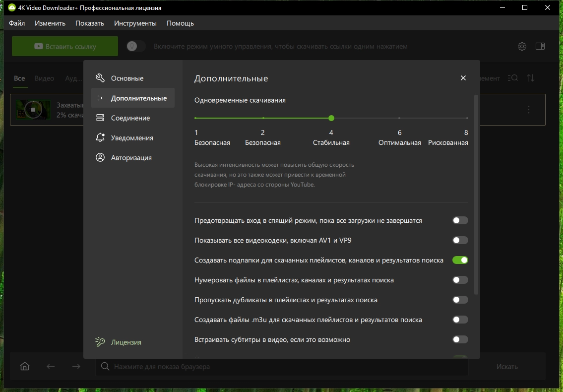 4K Video Downloader — неплохая утилита для скачивания видео, аудио и субтитров с YouTube. Конечно, есть всякие онлайн-сервисы для этого дела, но они не обеспечивают таких возможностей, которые есть в этой программе. Например, можно скачать целый канал, подписаться на скачивание новых видео, загружать плейлисты, а также импортировать список ссылок для скачивания. В настройках можно выбрать количество потоков, скорость скачивания, а также опции уведомлений.