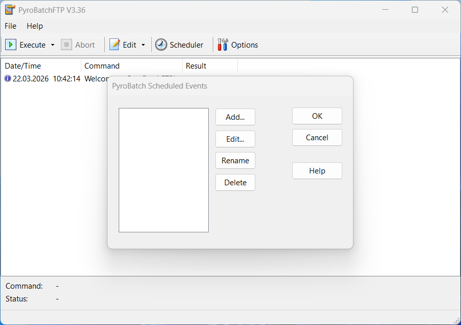 стандартная версия также может планировать задания PyroBatchFTP, но будет выполнять их только до тех пор, пока PyroBatchFTP активен для авторизованного пользователя.