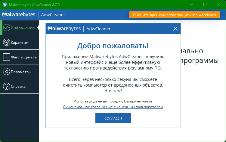 Удаление рекламы из браузеров Malwarebytes AdwCleaner 8.7.0.619 Beta