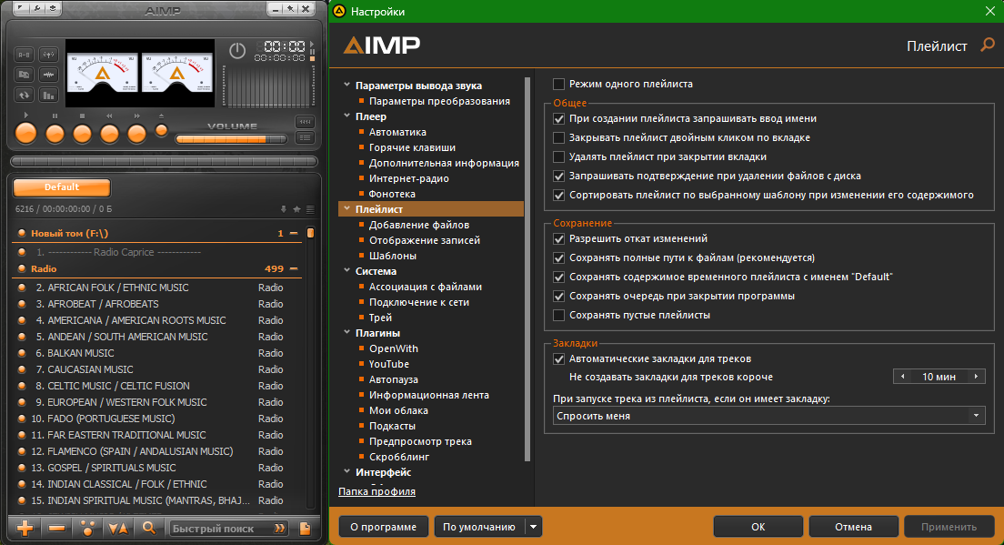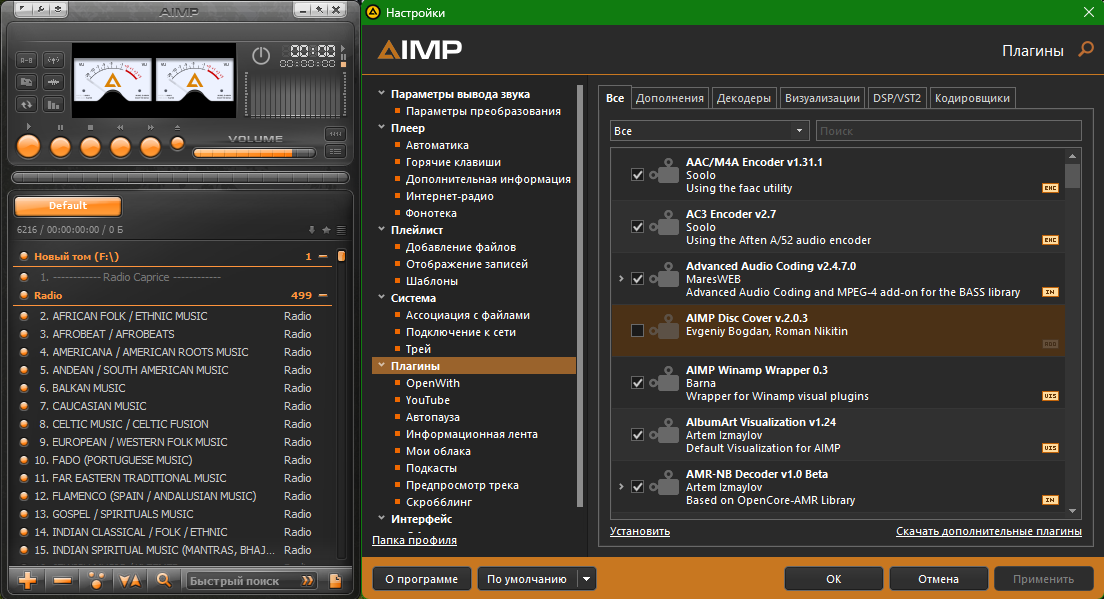 скинов, кодировщиков, плейлист радиостанций: Radio Caprice, 101.RU, Зайцев.FM, DI FM, 1.FM,