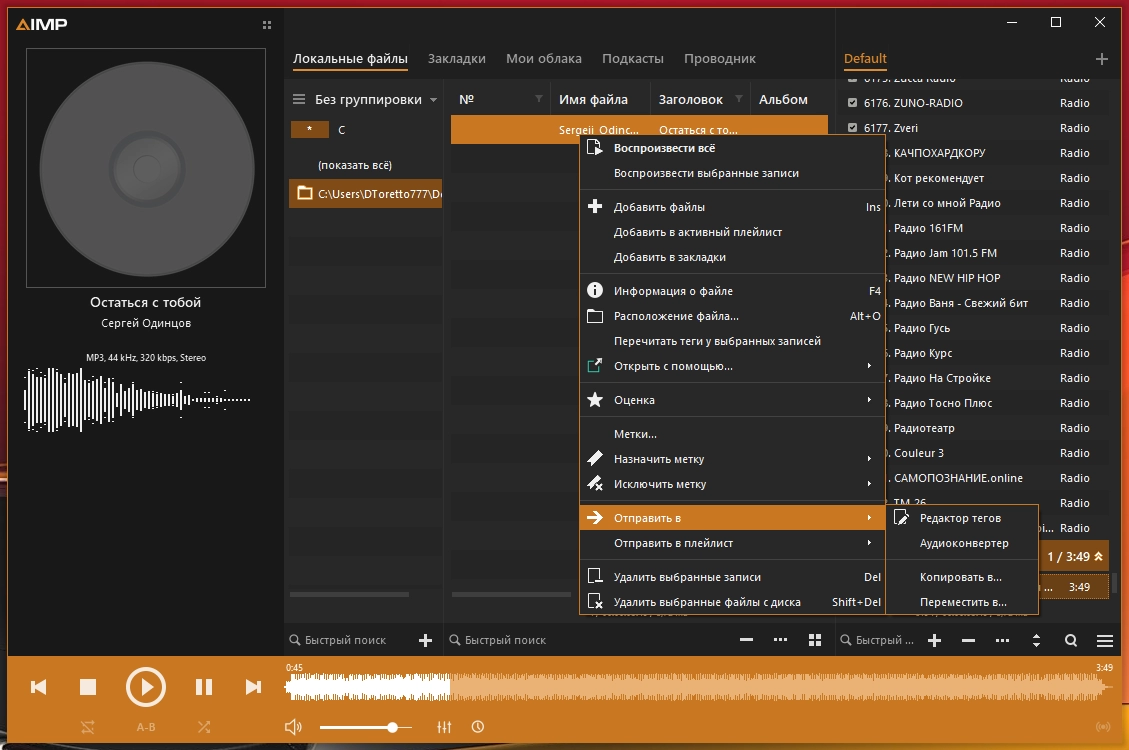скинов, кодировщиков, плейлист радиостанций: Radio Caprice, 101.RU, Зайцев.FM, DI FM, 1.FM,