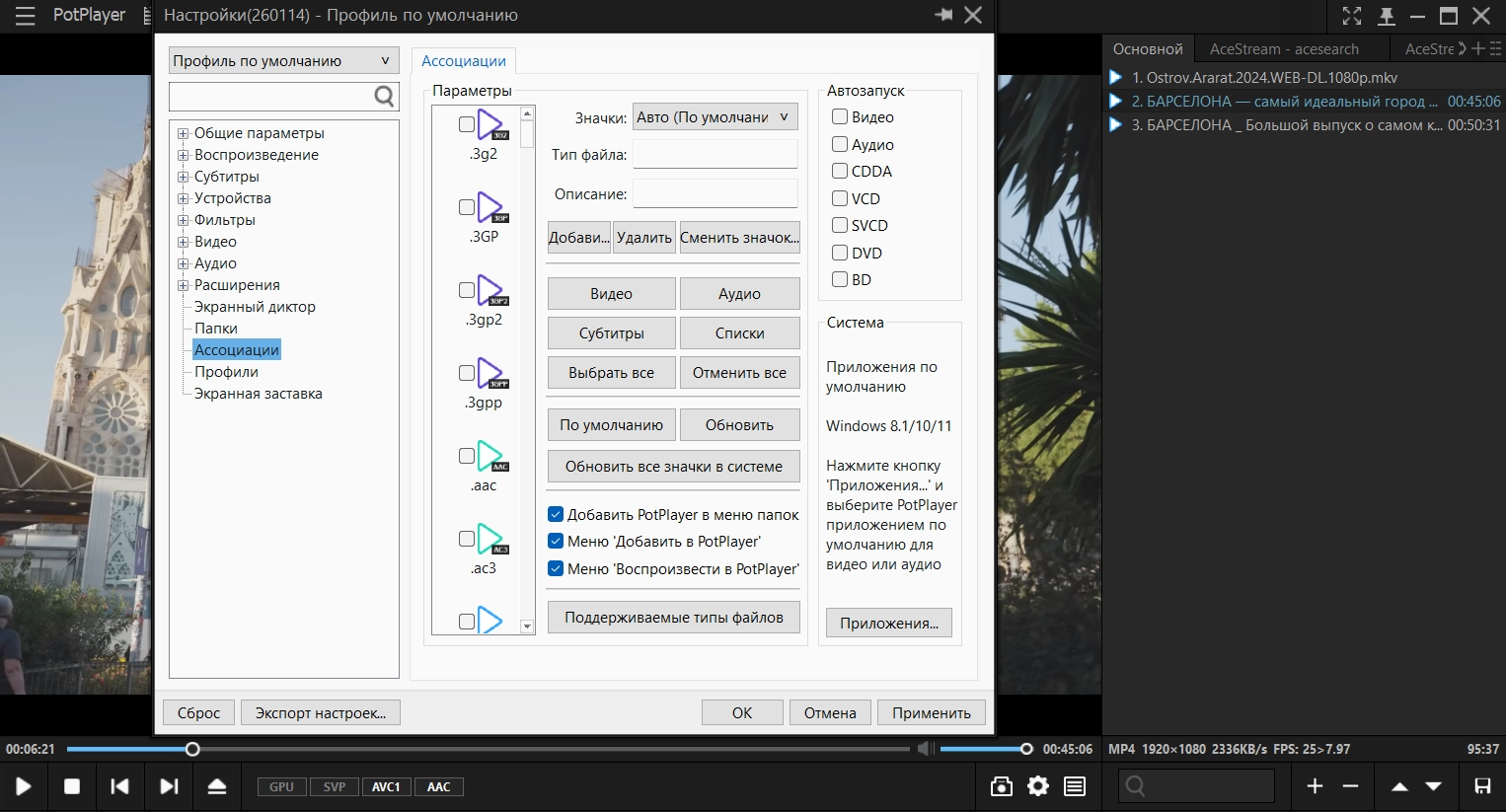 7. Возможность ассоциации плеера только с основными типами видео-файлов или