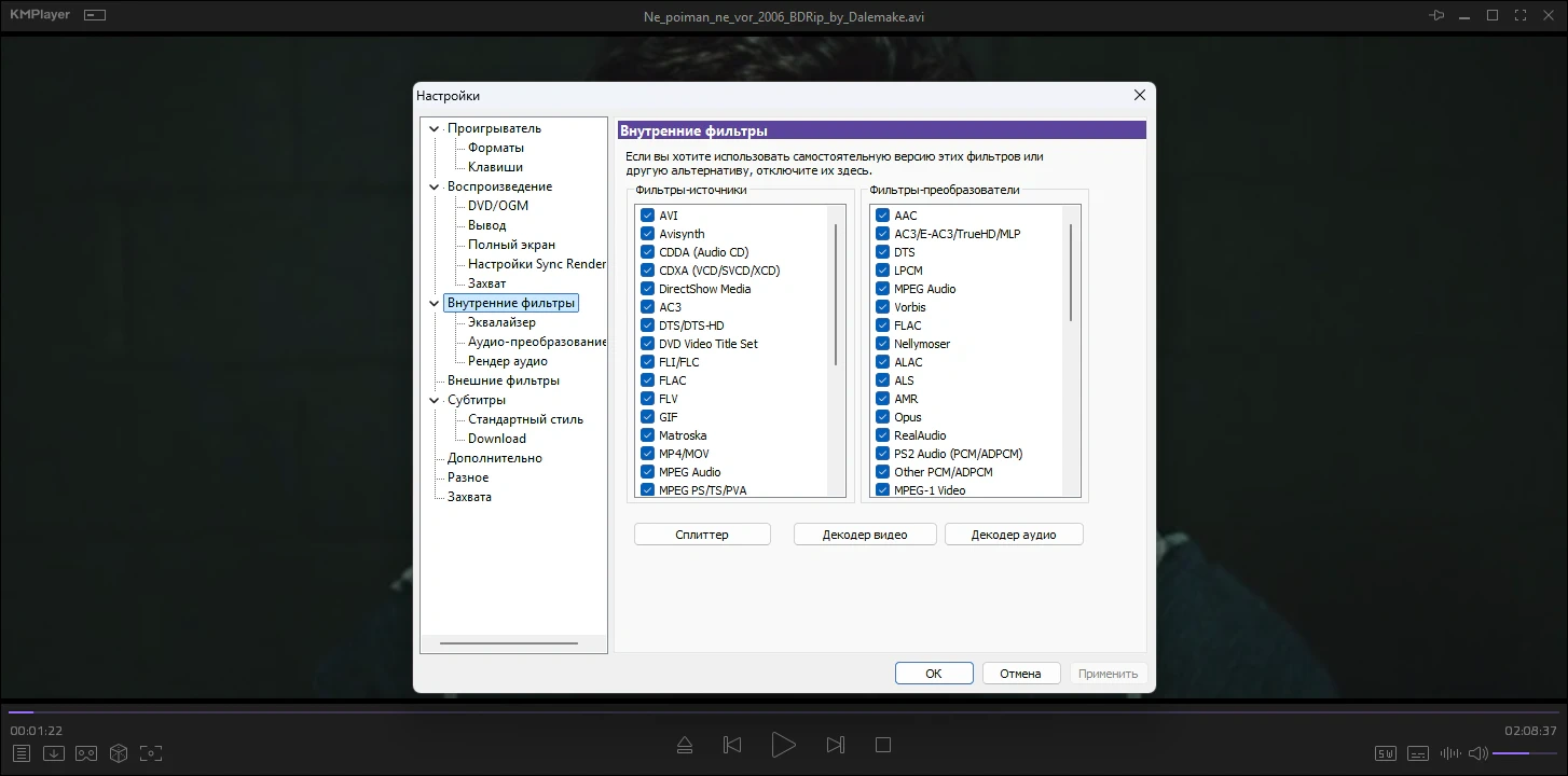 The KMPlayer – это мощный мультимедиа проигрыватель, предназначенный для воспроизведения аудио/видеофайлов практически всех возможных форматов. Убедиться в этом и испытать его в работе очень просто - достаточно скачать KMPlayer и запустить, никакие дополнительные установки не нужны, тем более, что такие кодеки, как DVD, AVI, VCD, Ogg, MKV, mp3, OGM, 3GP, MPEG-1/2/4, WMV, RealMedia, FLV и QuickTime в KMPlayer уже встроены. Плеер наделён потрясающим дизайном, интуитивным интерфейсом, абсолютным разнообразием настроек и функций. Всё это позволяет создать индивидуальное внешнее оформление и настроить воспроизведение мультимедиа контента так, что это будет полностью соответствовать вашим личным предпочтениям. Вполне вероятно, что с KMPlayer ощущения от просмотра фильмов и прослушивания музыки станут гораздо ярче!
