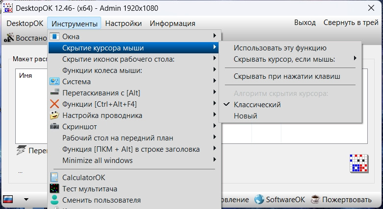 • Из-за встроенных дополнительных инструментов рабочего стола она практически незаменим на каждом ПК с Windows, поэтому имя также является DesktopOK, а не просто Icon Save. Я хотел бы расширить его другими полезными функциями, чтобы они соответствовали названию, вы можете найти их в меню «Инструменты», большинство из них говорят сами за себя!