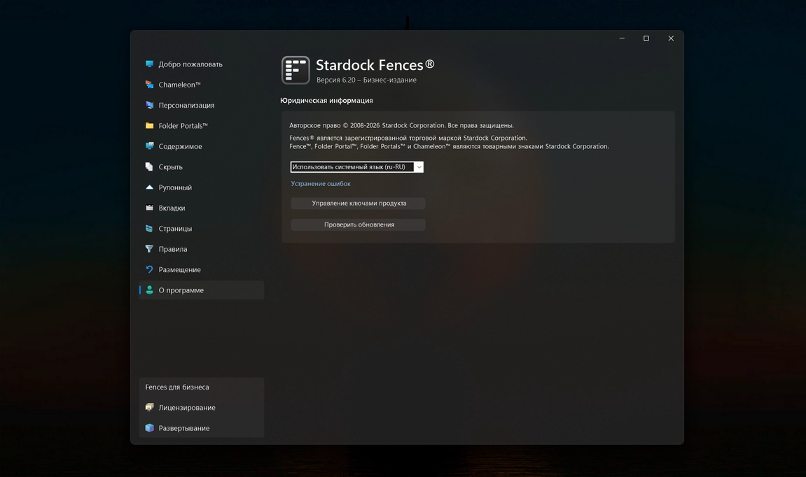 Stardock Fences 6.20 Business edition — мощная утилита для организации рабочего стола Windows 10/11, самая свежая стабильная версия на март 2026 года от 9 декабря 2025 года