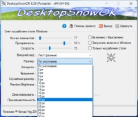 Добавить немного ощущение зимней магии с помощью DesktopSnowOK - небольшой утилиты, которая украшает рабочий стол падающими снежинками . Программа легко настраивается, не требует установки. Количество снежинок, которые одновременно появляются на экране можно менять. Минимально количество - 5, максимальное 64. Нужно отметить, что количество снежинок близкое к 30 создает приятное чувство легкого спокойного снегопада, но при этом совершенно не мешает работать. В настройках DesktopSnowOK вы также найдете прозрачность снежинок, и скорость их падения. Также доступно большое количество видов снежинок - шарики, звездочки, и даже текстуры в виде прозрачных футбольных мячей. Среди большого количества языков интерфейса есть и русский язык.