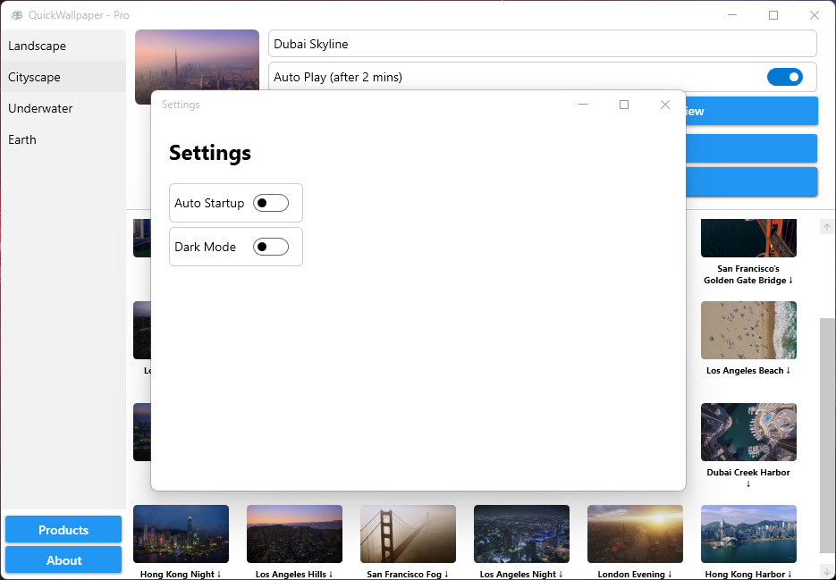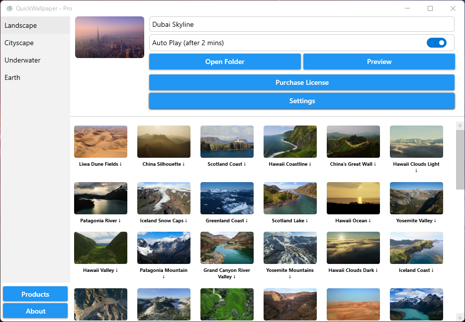Quick Wallpaper — это программное обеспечение, которое адаптирует динамические обои-заставки 4K 240 кадров в секунду для Windows 11. Обои включают четыре темы: «Природные пейзажи», «Городские пейзажи», «Подводные сцены» и «Земля».