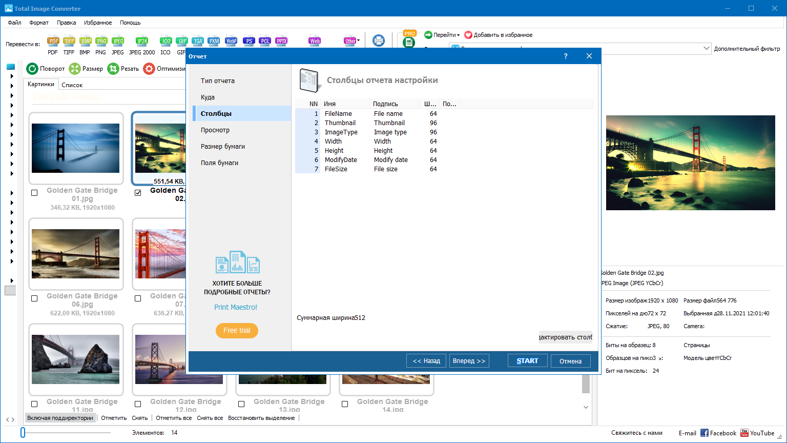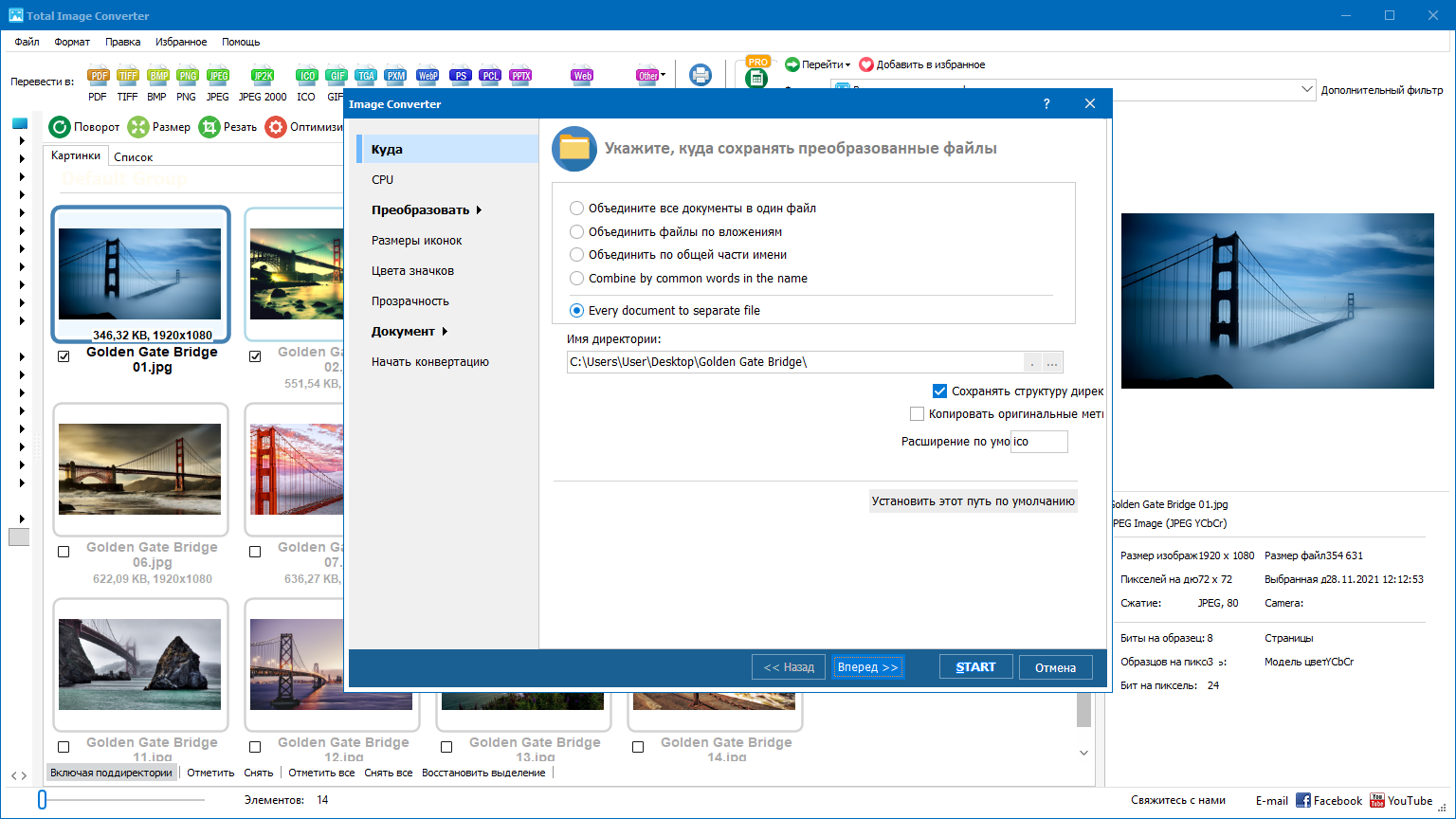 Total Image Converter имеет интуитивно понятный пользовательский интерфейс для работы с изображениями. Вы можете легко просматривать изображения с помощью программы до и после конвертации файла. Вы можете работать как с подробным списком файлов (название, размер, тип, исправления, атрибуты) или с их эскизами.