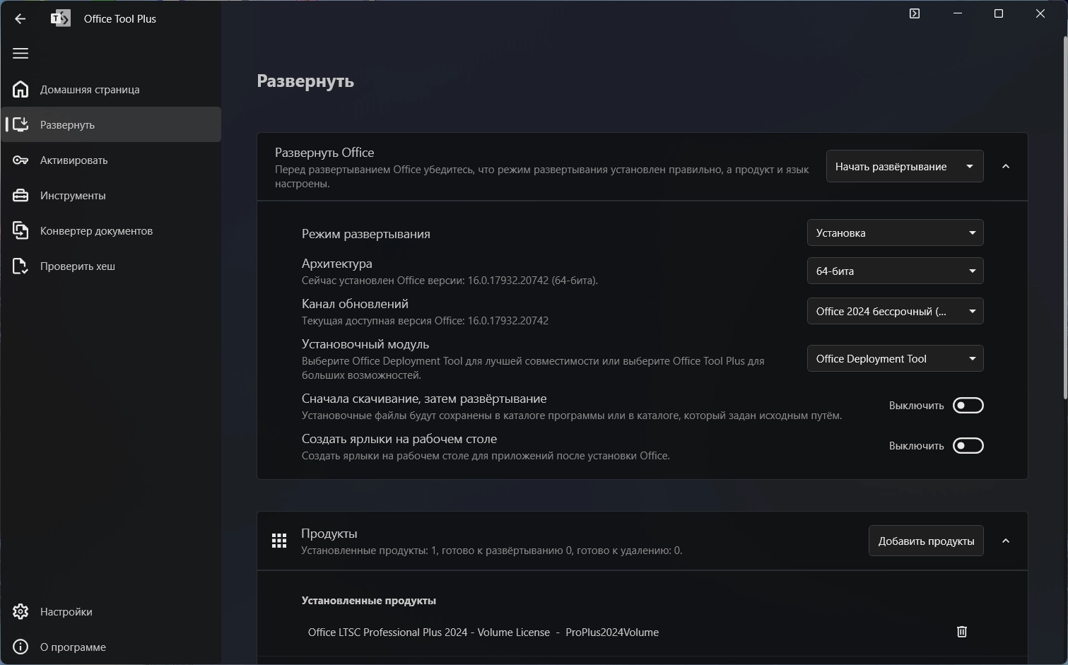 Office Tool Plus - функциональная программа для работы с Office от компании Microsoft. Позволит вам выполнить модернизацию текущего офиса, допустим изменить канал обновления, если есть желание возможно удалить лишние языковые пакеты, можно сам офис полностью удалить из системы. Плюс у вас не будет больше проблем с активацией, теперь максимально легко установить ключ продукта, настроить сервер KMS и так далее, обратите внимание, сам софт не занимается активацией, он просто дает нужные настройки и возможности для этого. Вы получаете интерфейс, через который легко загрузить нужную версию Office с желаемыми языковыми пакетами, вы можете удалить лишние компоненты, которые вам кажутся ненужными.