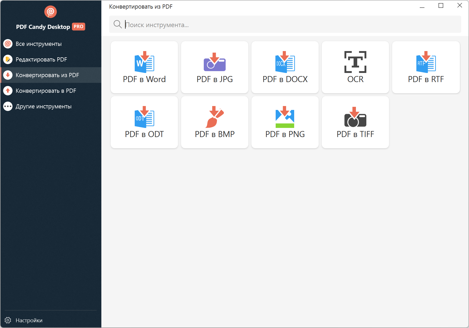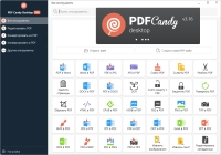 PDF Candy Desktop — универсальный инструмент, который позволит Вам конвертировать PDF файлы в различные форматы (PDF в DOC, PDF в JPG и т. д.), конвертировать документы, электронные книги и изображения в PDF, склеивать и разбивать PDF, извлекать изображения и текст из PDF, редактировать метаданные, защитить PDF паролем или снять пароль с защищенных файлов. Большинство режимов поддерживает одновременную обработку множества файлов.