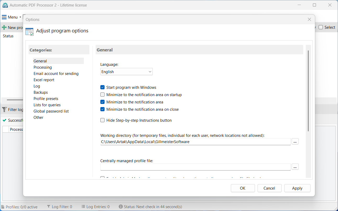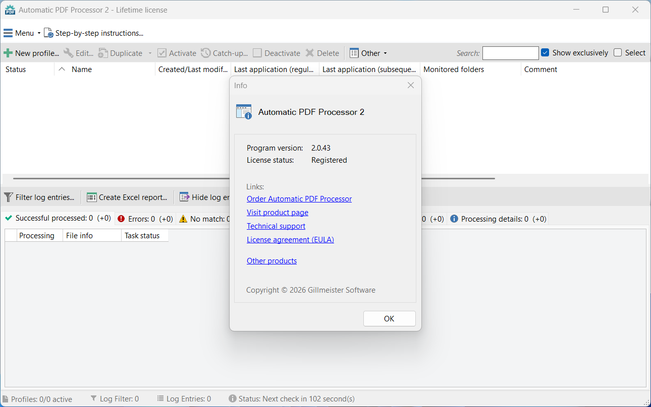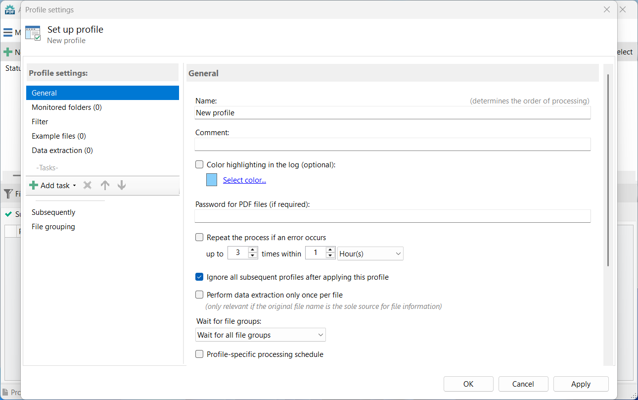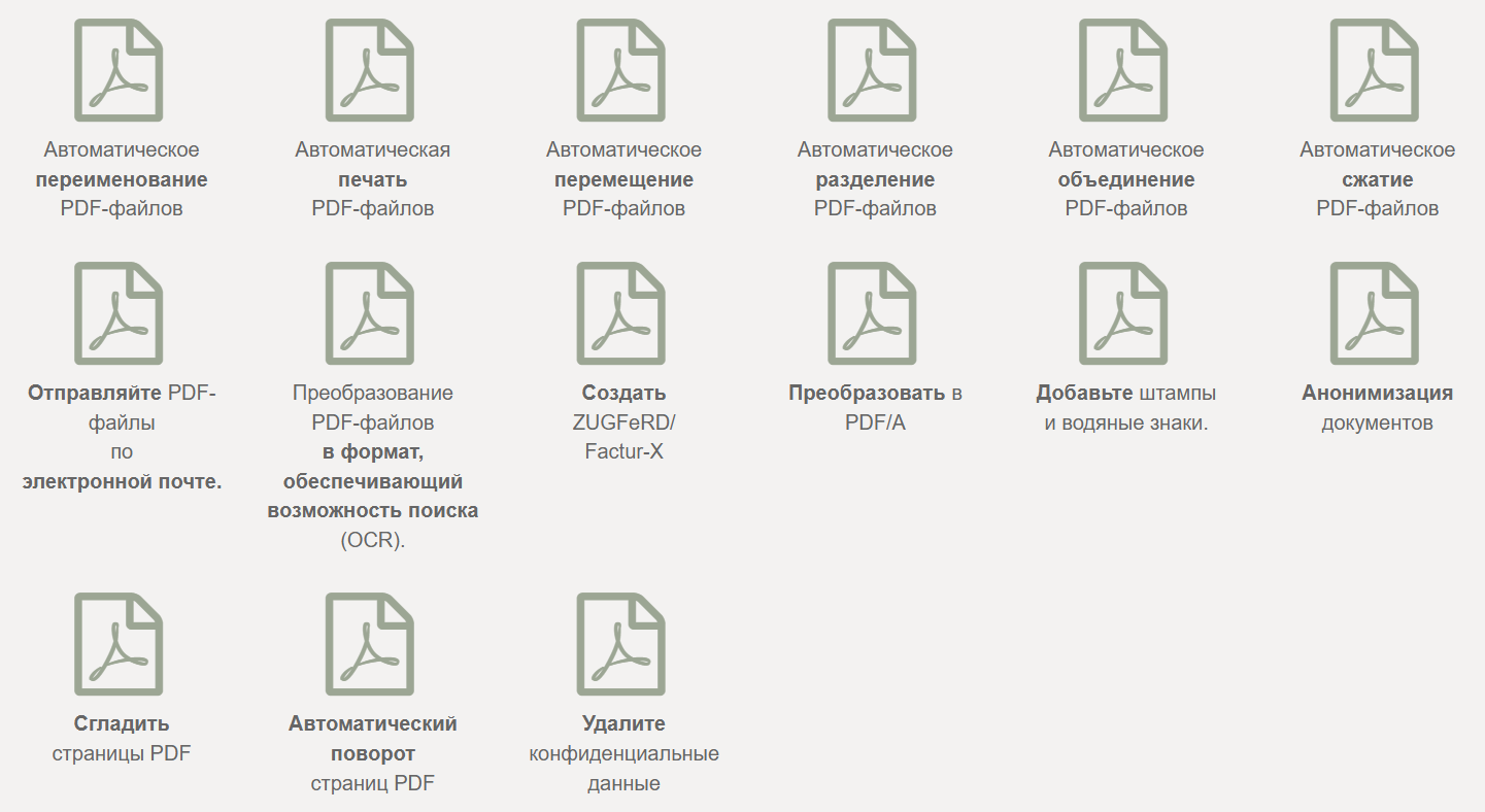 Программа Automatic PDF Processor может автоматически обрабатывать PDF-файлы. Можно отслеживать любое количество папок для автоматической печати, переименования, сжатия или перемещения входящих PDF-файлов в папки с динамическими именами. Программа предлагает 24 различных типа задач , которые можно комбинировать в любом порядке. Многочисленные метаданные PDF-документов могут использоваться вместе с содержимым, например, для включения информации о счете-фактуре в путь к файлу.