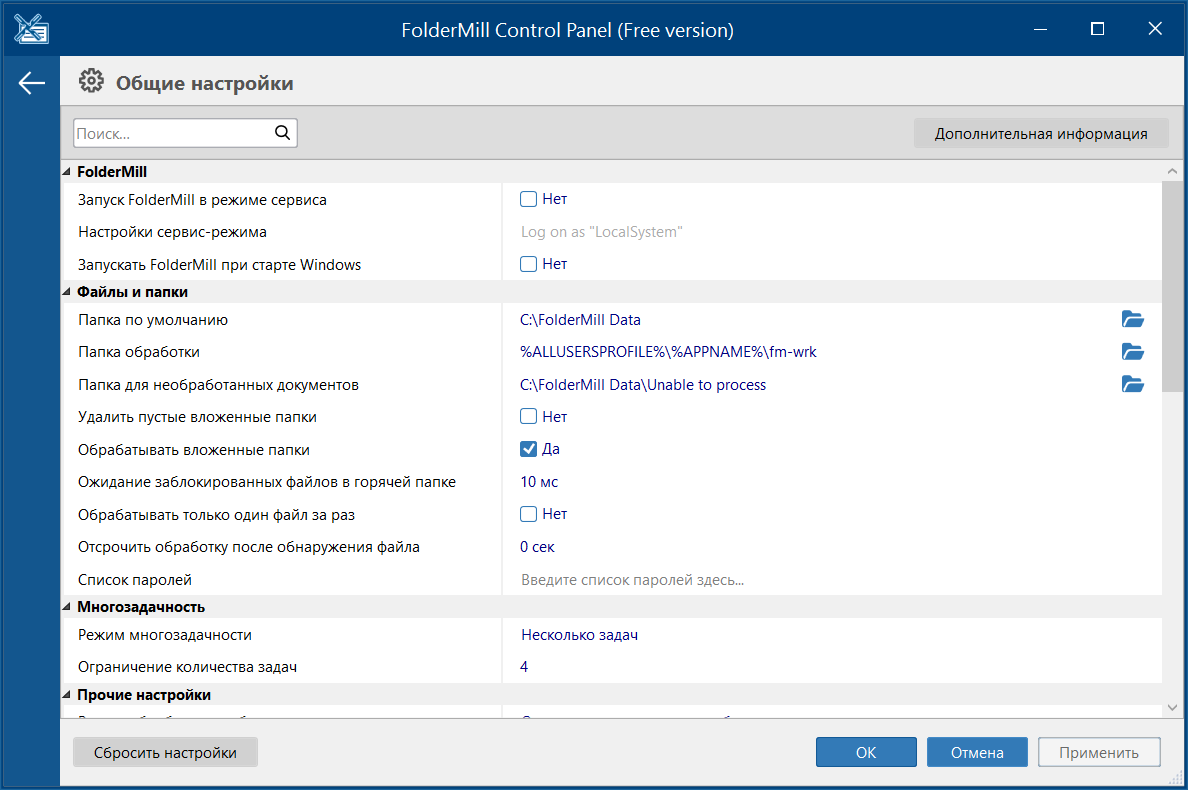 FolderMill — это серверное приложение, которое отслеживает определенные «горячие папки» и автоматически преобразует входящие файлы или печатает их на указанном принтере. Оно обрабатывает входящие документы в соответствии с предопределенными правилами на сервере, рабочей станции или настольном ПК в корпоративной среде.