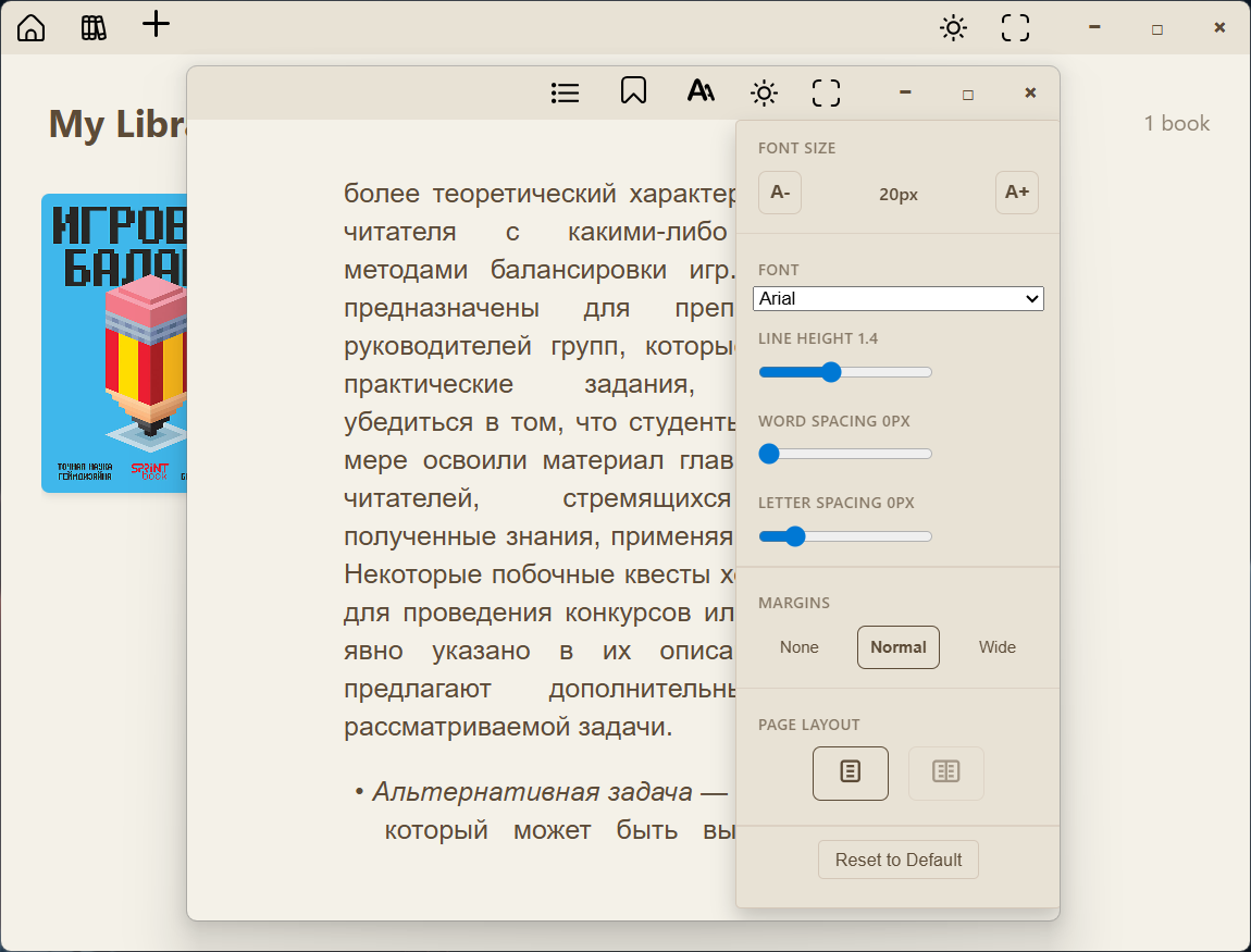 • Просматривайте все свои книги в упорядоченном виде в виде сетки или списка. Синхронизируйте папки с книгами и редактируйте названия, авторов и обложки. Изменяйте шрифт, размер текста, отступы, межстрочный интервал и межсловное расстояние. Выбирайте из тем оформления, включая режим «истинно черный». Изящный, современный интерфейс без отвлекающих факторов, создающий наилучшие условия для того, чтобы полностью сосредоточиться на чтении.