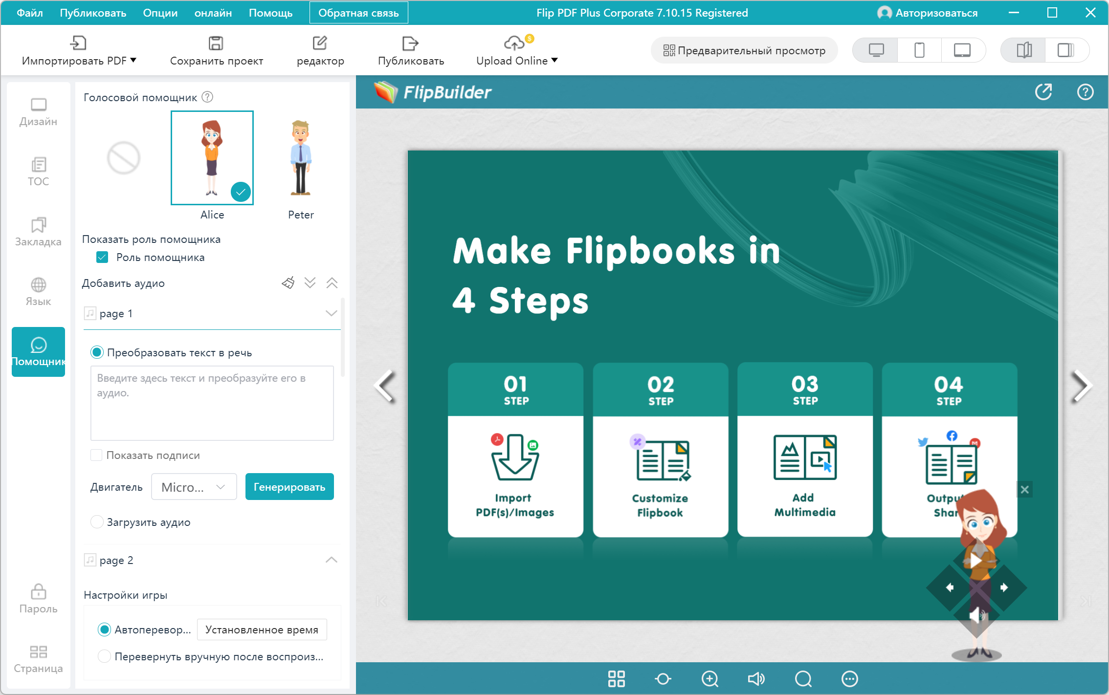 • Подсказки от Помощника и советы по улучшению прокрутки вашей книги, запись или вставка звука.