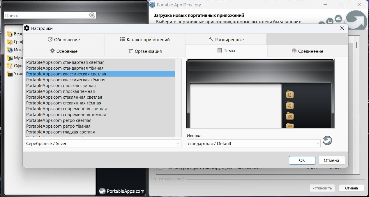 • Темы, цвета и Ваше личное меню. Хотите ли Вы, чтобы ваше меню выглядело современным или ретро, светлым или темным, гладким или простым, Платформа PortableApps.com имеет опцию для Вас. С дюжиной тем, каждая с радугой цветных выборов, Вы можете просмотреть и выбирать каждый день в течение многих месяцев и никогда не иметь то же самое меню дважды. И Вы можете сделать меню вашим собственным, добавляя ваше собственное личное изображение в верхнем правом углу.