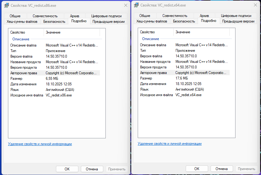 • Пакеты VC++ 2015–2022 полностью бинарно совместимы между собой. Это означает, что программы, собранные под Visual Studio 2015, 2017, 2019 и 2022, могут использовать один и тот же redistributable пакет.