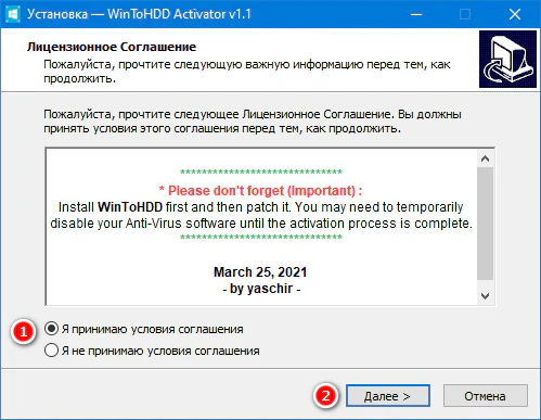 2. Запустить файл WinToHDD Activator v1.1.exe от имени Администратора.
