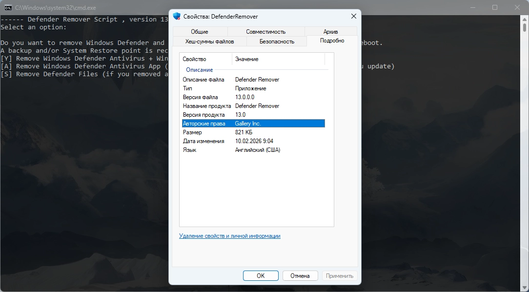 Небольшая утилита, которая предоставляет удобный способ отключить защитник Windows вместе с различными соответствующими службами всего одним щелчком мыши. Не волнуйтесь, так как вы можете включить его снова, если вдруг передумаете. Defender Remover удаляет / отключает Защитник Windows, включая приложение безопасности Windows, безопасность на основе виртуализации Windows (VBS), Windows SmartScreen, службы безопасности Windows, службу веб-угроз Windows и виртуализацию файлов Windows (UAC), Microsoft Defender App Guard, Microsoft Driver Block List и страницу настроек Защитника Windows (в приложении «Настройки», Winodws 10 или новее).