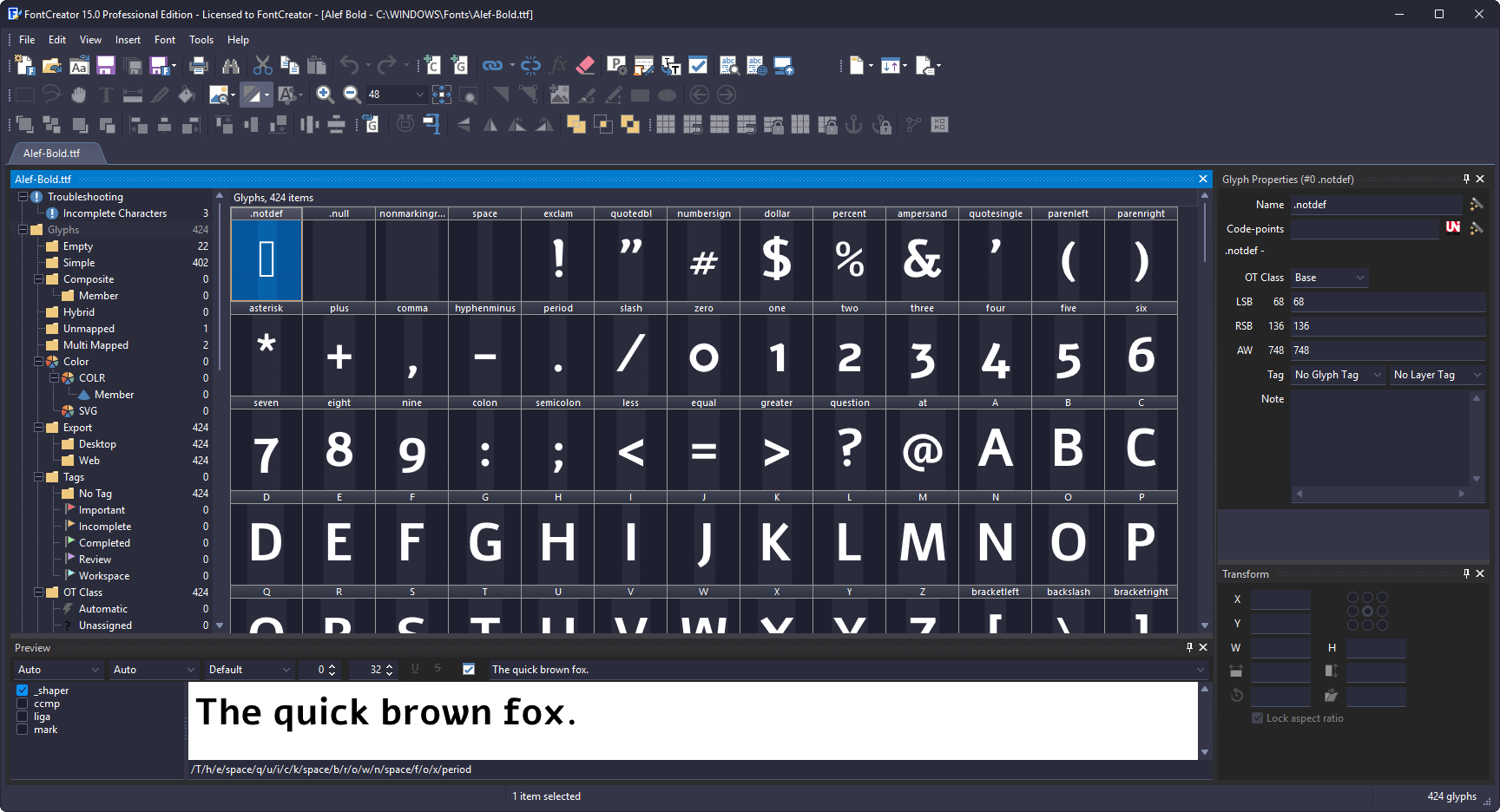 FontCreator - Редактор шрифтов FontCreator может создавать свои собственные шрифты, переводить в файл шрифта любой шрифт с бумаги через сканирование, редактировать уже установленные шрифты. Для создания собственного рукописного шрифта можно просто написать на бумаге от руки (если нет планшета) все русские и английские буквы, цифры, специальные знаки, знаки препинания и т.д., отсканировать этот лист и через "копировать-вставить" вставить каждый символ в каждую ячейку глифа нового шрифта соблюдая индексы. В издании Professional функции проверки шрифта позволяют улучшить качество ваших шрифтов. Инструменты позволяют упростить и ускорить процесс проектирования глиф. Мощная трансформация скрипта позволяет создавать сотни дополнительных символов в секундах, позволяет автоматически создавать контуры для более чем 2200 символов.