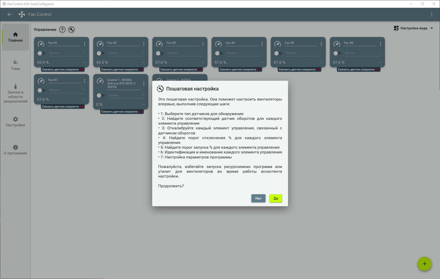FanControl – свободно распространяемый продукт, позволяющий контролировать различные аспекты кулеров на вашем компьютере. Программа имеет открытый исходный код и для запуска не требует даже инсталляции. То есть, приложение является портативным средством. Удобный современный интерфейс приложения, плюс ко всему ещё наделён мастером настройки, который позволит найти все датчики температуры и скорости.