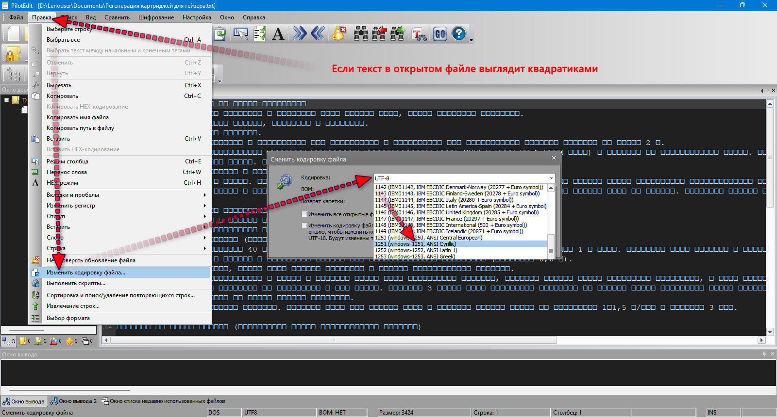Если текст в открытом файле отображается квадратиками: