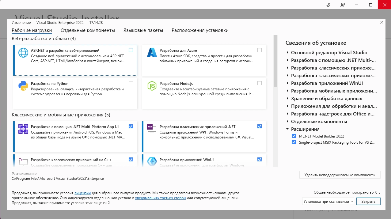 • Для работы Visual Studio требуется .NET Framework 4.8. Если .NET Framework 4.8 еще не установлен, он будет установлен во время установки.