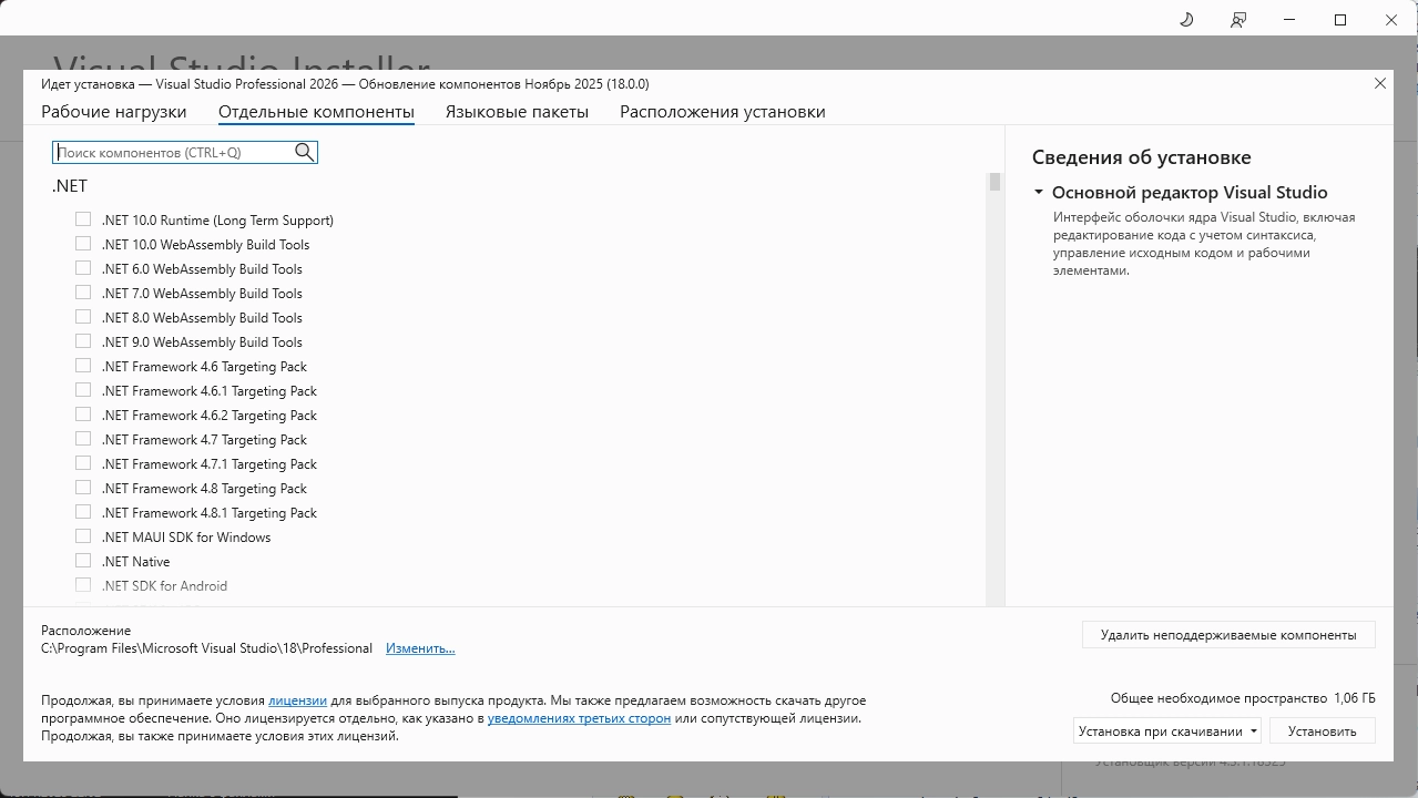 • Для установки Visual Studio необходима платформа .NET Framework 4.7.2 или более поздней версии. Visual Studio требует запуска .NET Framework 4.8. Если платформа .NET Framework 4.8 еще не установлена, то будет выполнена ее установка.