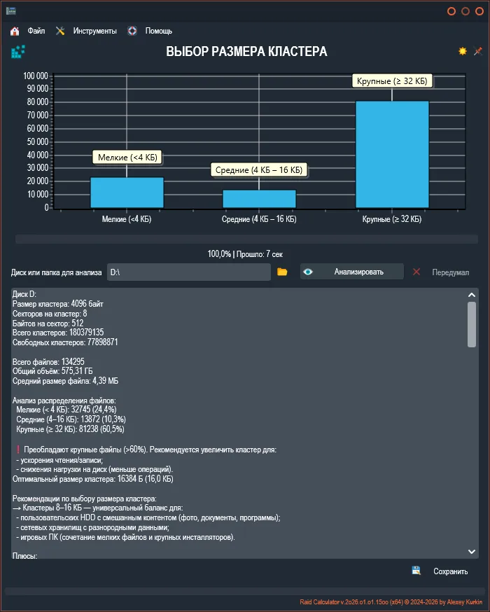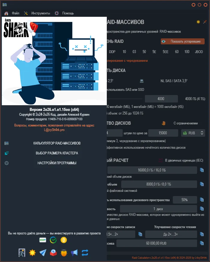 «RAID Calculator» - это бесплатный инструмент для расчёта эффективности использования дискового пространства при создании различных уровней RAID-массивов. Программа поможет вам заранее оценить параметры будущего массива и принять взвешенное решение о его конфигурации