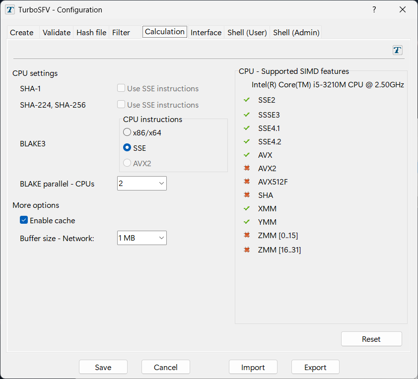 • BLAKE3-256, BLAKE3-512, BLAKE3-1024 и BLAKE3-2048 (опционально с использованием специальной реализации на основе расширения набора инструкций SSE или AVX2 (Advanced Vector Extensions)).
