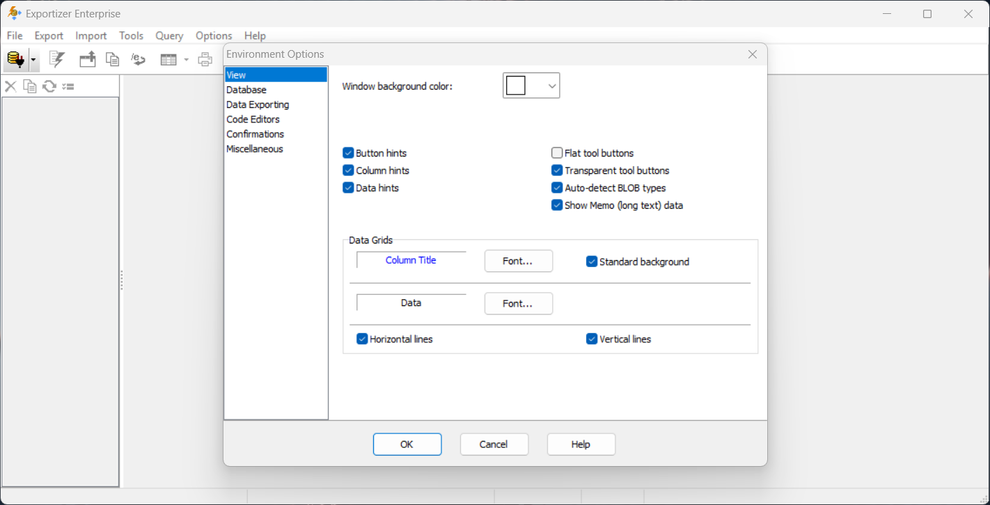 • Exportizer отображает данные в расширенной табличной форме базы данных, что позволяет просматривать и обрабатывать данные наиболее удобным способом. Например, можно сортировать данные, щелкая по заголовку столбца, изменять порядок и размер столбцов, увеличивать высоту строк для просмотра крупного текста или изображений Blob, использовать режим просмотра одной записи и т. д.