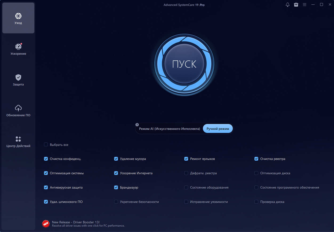 Выполняет полный спектр работ для достижения наилучшей производительности. Простая очистка реестра не может обеспечить действительно серьезного увеличения скорости работы. Advanced SystemCare Pro совмещает очистку реестра, дефрагментацию, тонкую настройку системы, восстановление поврежденных ярлыков, удаление персональной информации из временных файлов, удаление ненужных файлов, восстановление и оптимизацию диска и многое другое – все, что требуется, чтобы ваш компьютер работал как новый.