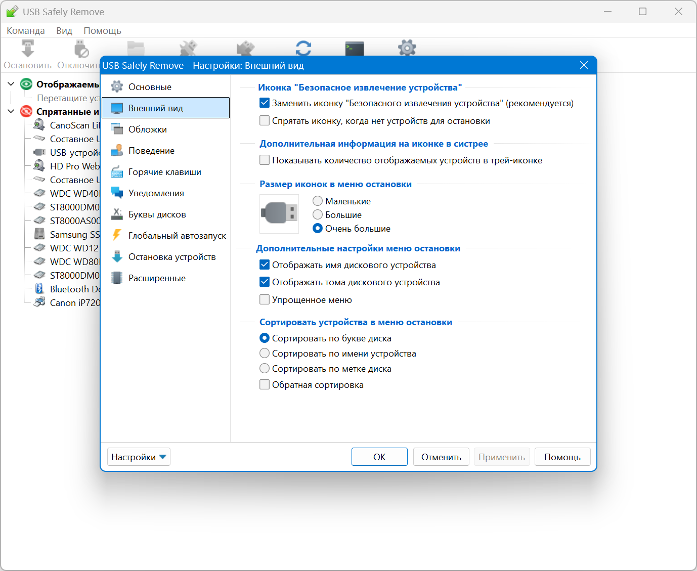 Удобное меню для извлечения устройств