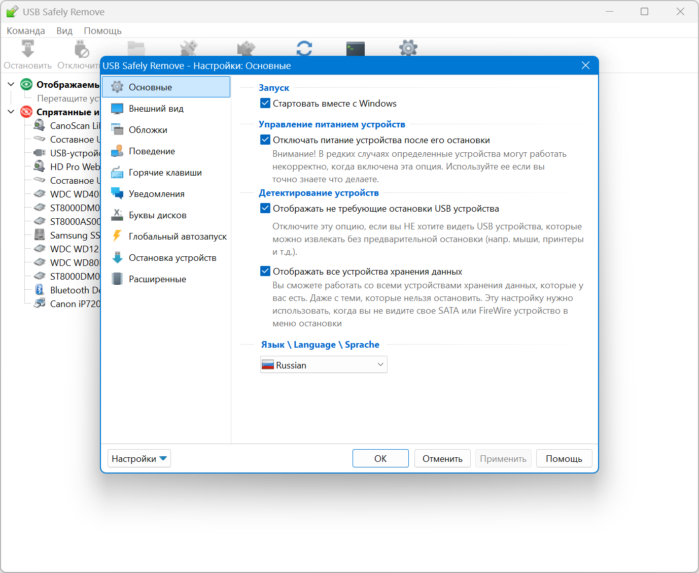 • Еще одно важное отличие программы от стандартной иконки Safely Remove Hardware - возможность видеть и отключать все hot-plug устройства, подключенные к Вашему компьютеру. Если USB Safely Remove не показывает нужное Вам устройство, то включите в настройках USB Safely Remove галочку "Отображать все устройства хранения данных".
